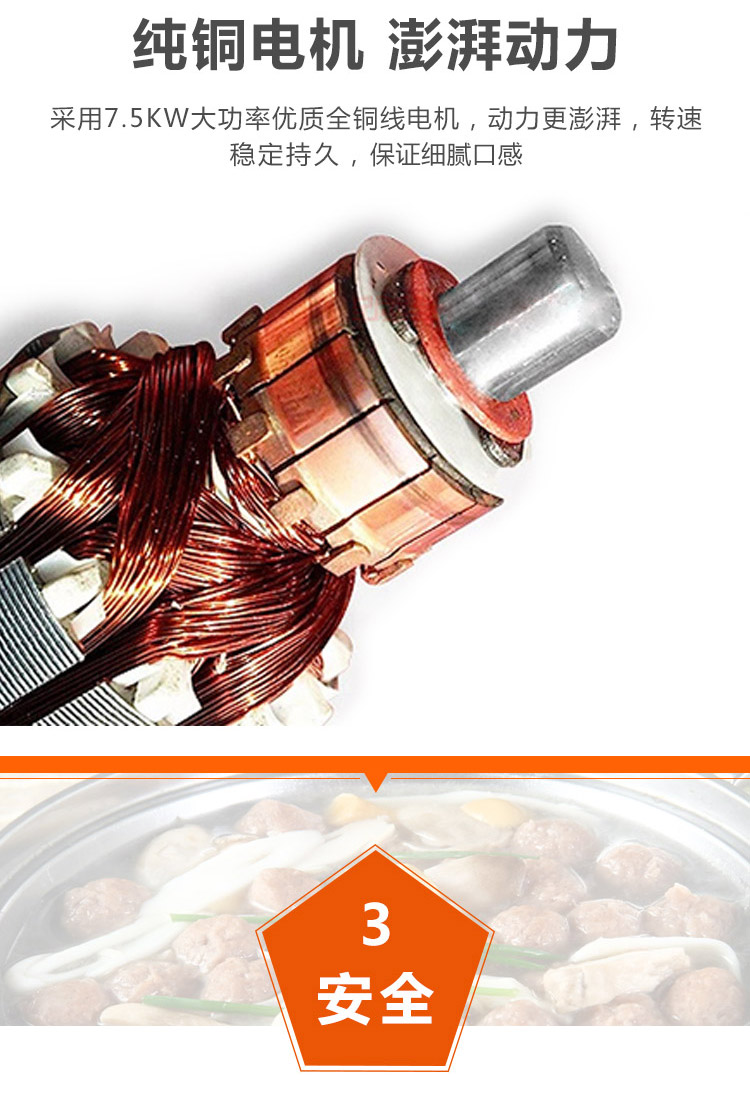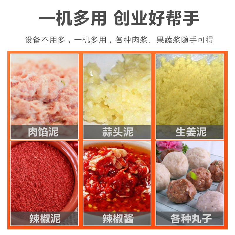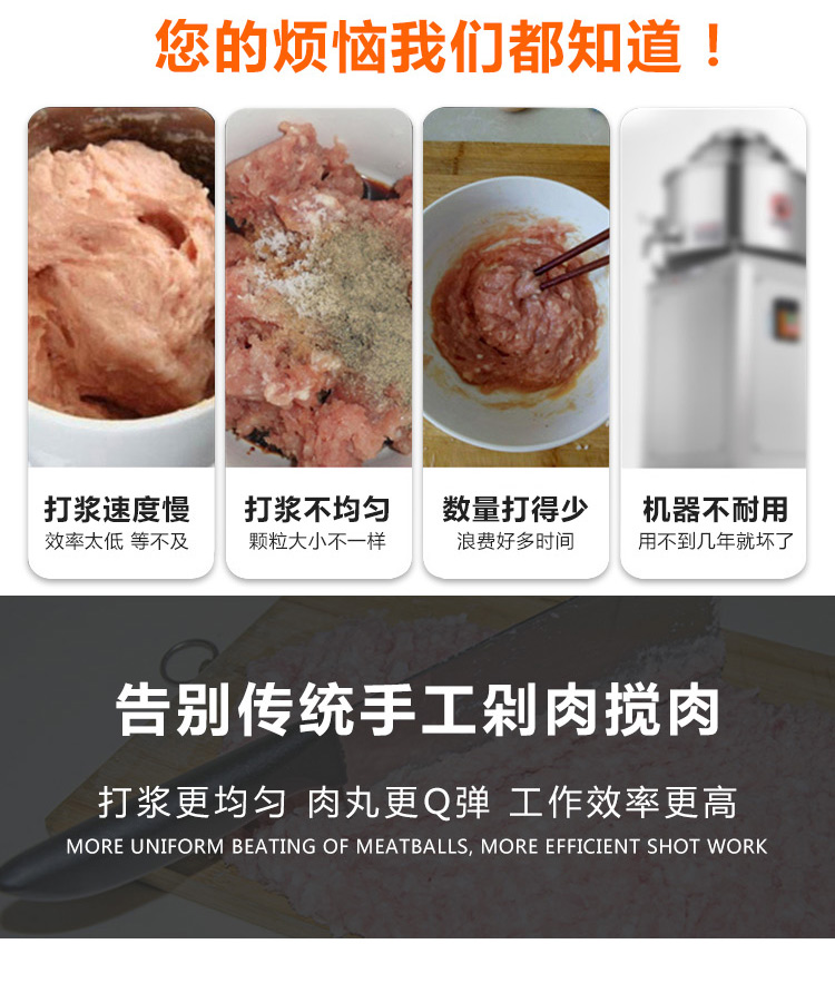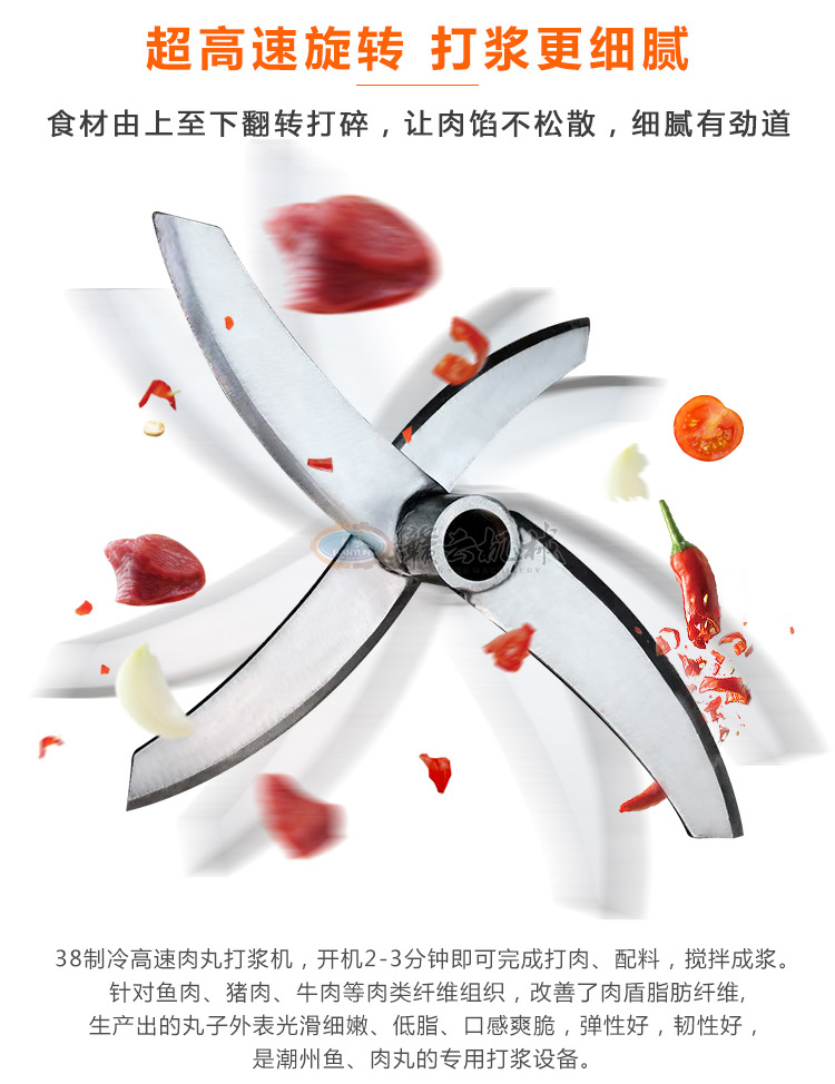 多功能肉丸打漿機擁有高速旋轉,達到快速碎食效果,讓打漿更細膩,讓您告別傳統手工剁肉攪肉打漿,將食材放入打漿機器入料口,食材由上至下翻轉打碎,讓肉餡不松散,細膩有勁道,此款38制冷高速肉丸打漿機,開機2-3分鐘即可完成打肉、配料、攪拌成漿。針對魚肉、豬肉、牛肉、等肉類纖維組織、改善了肉質脂肪纖維,生產出來的丸子外表光滑細嫩、低脂、口感爽脆,彈性好,韌性好,是潮州魚、肉丸的打漿設備。