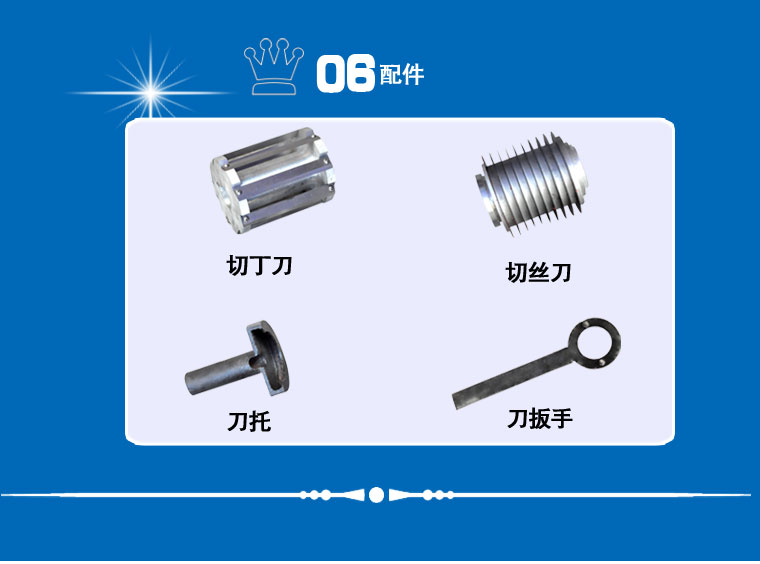 工作原理:GY-DQ-130型切丁機通過旋轉撥盤將被切物體帶動高速旋轉,利用物體的離心力,立刀將物體切成片狀,然后經過圓盤切絲刀片豎切成條狀,并將條狀物送入橫切斷刀口,由橫切斷刀盤切刀切成所需的長方體或立方體。