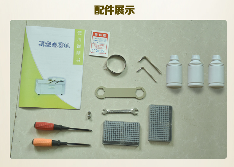 2、將所需包裝的物品裝入包裝袋【塑料復合袋或鋁箔復合袋】內,放入真空室內,提起壓條,均勻的把袋口置于熱封架上排好,然后放下壓條。