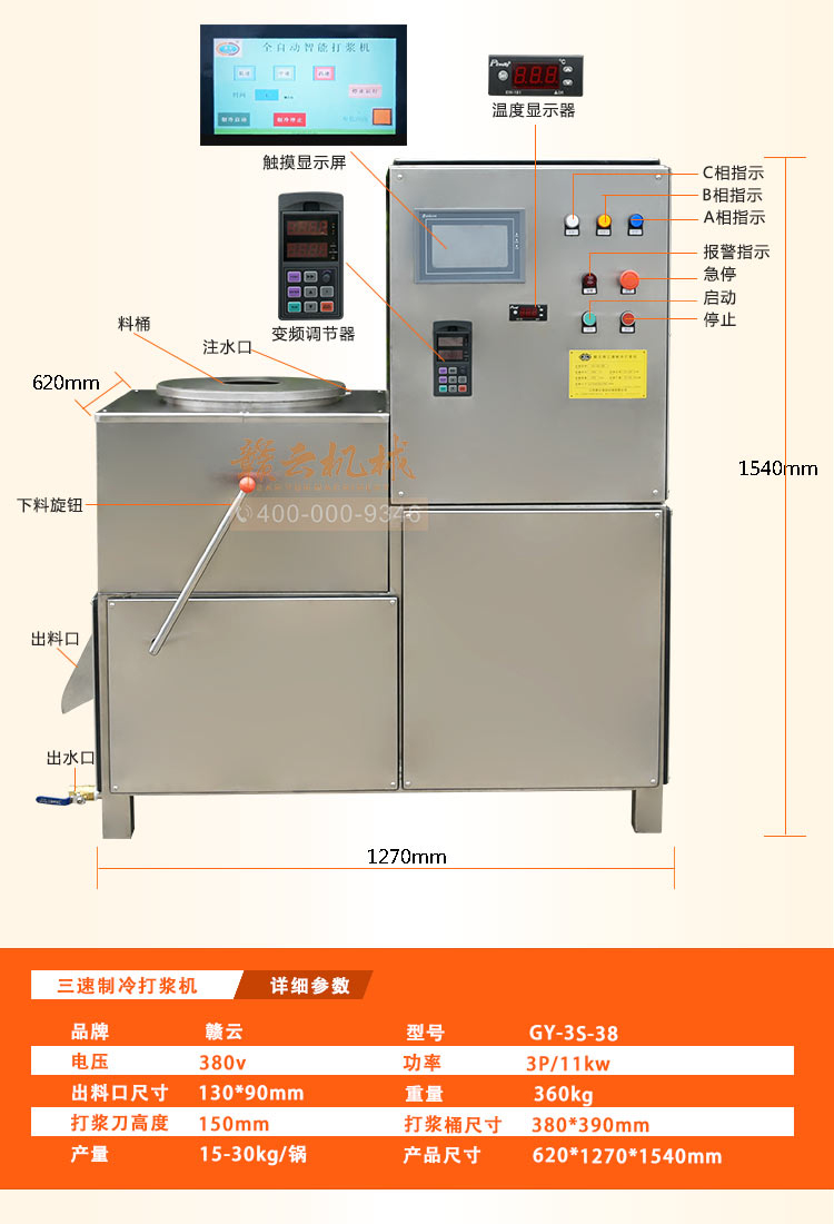 擁有一臺三速制冷打漿機,你就等于擁有:一臺慢速制冷打漿機、一臺高速制冷打漿機外加一臺變頻調速制冷打漿機,從投入的角度你就省了好幾萬。一臺三速制冷打漿機占地面積不到1.5個平方,而三臺機器占地面積至少需要8個平方,面積又省了,再看三速制冷打漿機,無需擔憂肉質問題,敏感的溫度感應自動報警停機系統,配合流水式出漿,省時省力,可安全放心生產,不僅是中小肉丸廠商選擇的打漿設備,同時也是大型肉丸廠實驗用制漿設備。贛云三速制冷打漿機,程序智能控制,傾力打造智能打漿設備的優良品質。贛云三速制冷打漿機,多功能打漿設備的贛云代表作品,引導打漿設備,贛云造,你值得擁有!