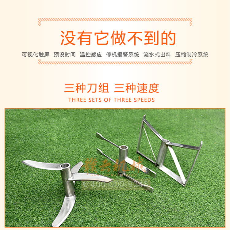 贛云三速制冷打漿機,采用智能操控系統 ,根據原料的不同選擇不同的速度進行打漿,三種速度配備三種刀組,分別是高速打漿刀,中速打漿刀和低速打漿刀。三機合一不僅占地面積小,集可視化觸屏操作、預設打漿時間、溫控感應系統、超負荷停機報警系統、流水式搖桿控制出料,并配備強勁的壓縮制冷系統,效果好,十分鐘就能達到理想的制冷效果,更好的保證了肉漿的鮮度。