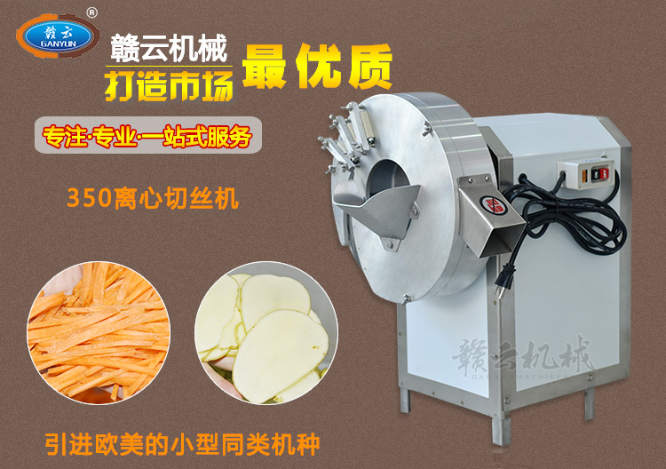 本機采用物料離心作用力使物料與桶壁固定刀片發生切割分離作用,可切出與物料長度基本一致的絲或片,整機采用201不銹鋼板材設計,離心切割部位采用鋁合金材料,耐腐蝕,長期使用不生銹,切絲規格固定不可調,可定制1-3mm切絲刀,將切絲到拆卸下來即可切片。是小型食堂、飯店等球根類切絲切片好幫手。