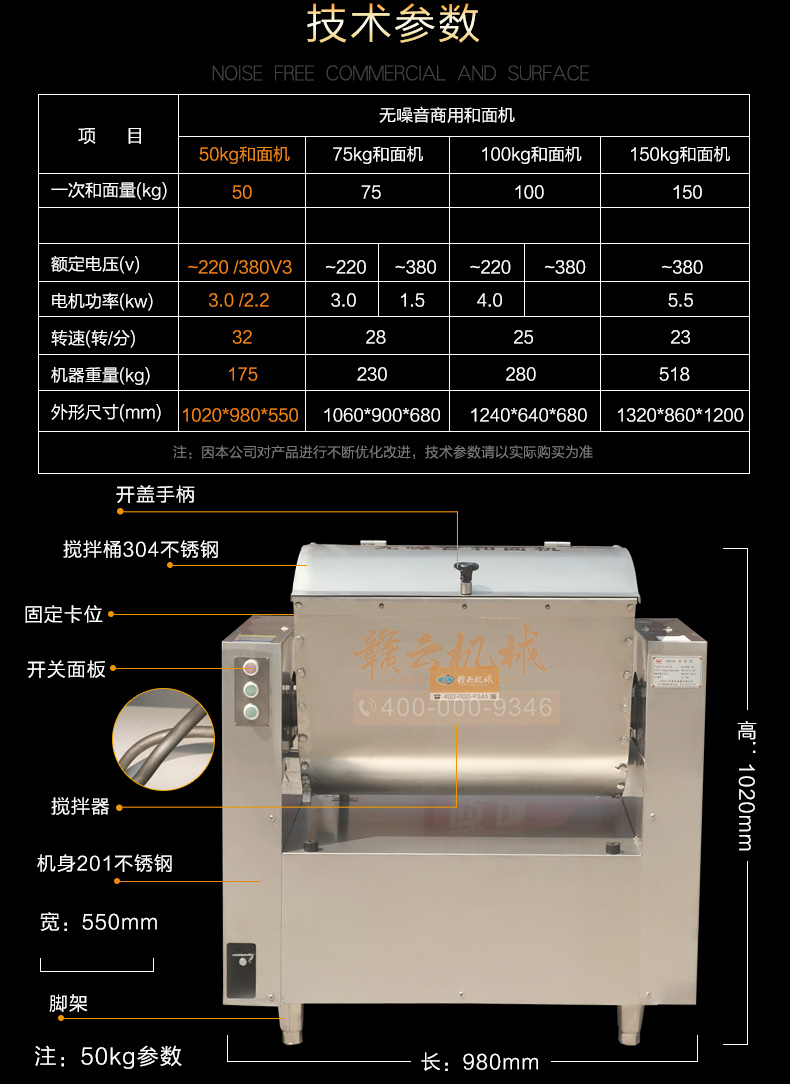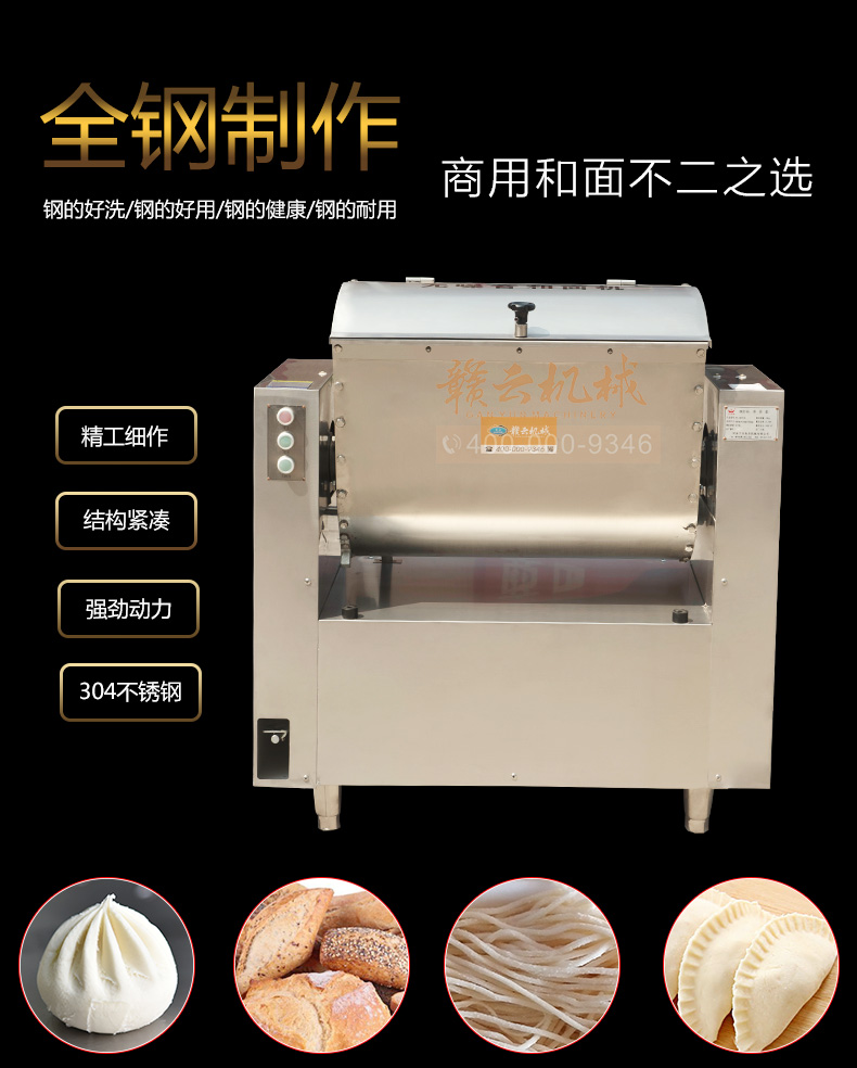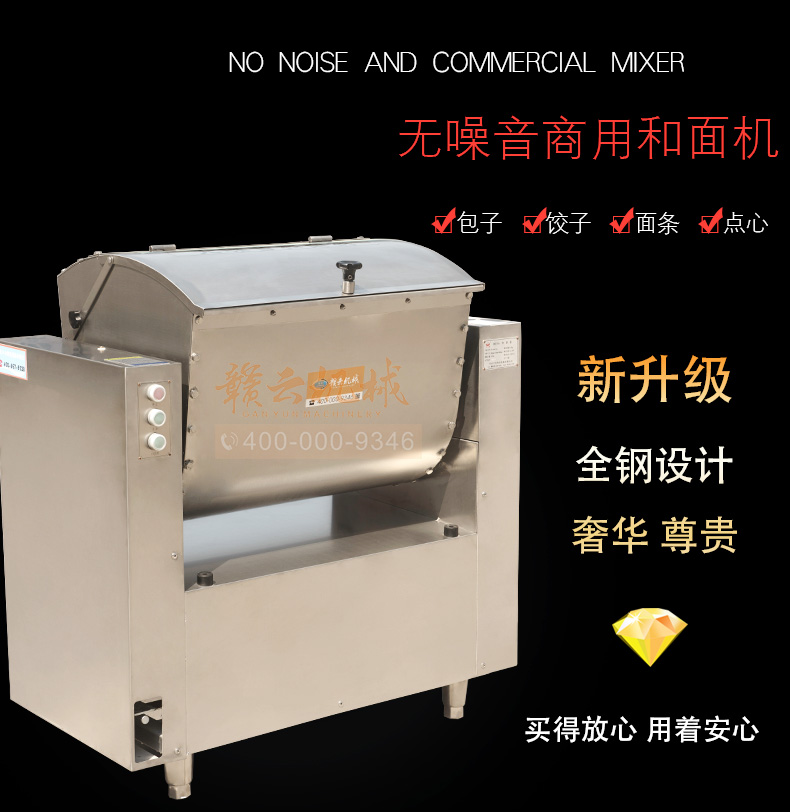 商用和面機,全不銹鋼無噪音商用和面攪拌機,本系列有15kg、25kg、50kg、75kg、100kg、150kg6個型號,其中15kg、25kg為手動倒料,50kg以上有自動翻斗倒料。