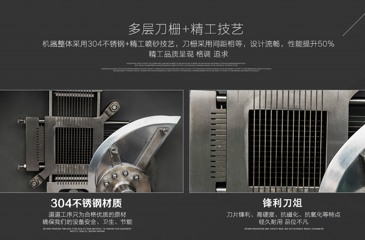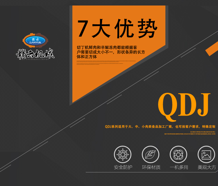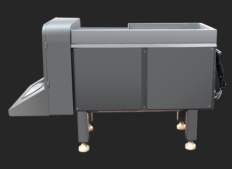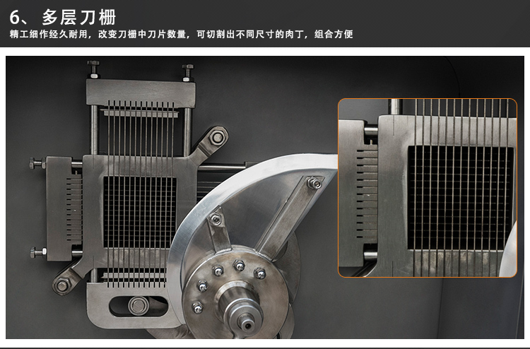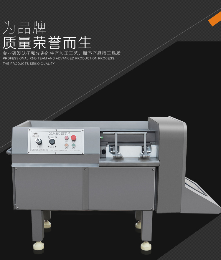 贛云350型切肉丁機,采用304不銹鋼噴砂處理技術,裝備優質刀組,利用流水線條設計,配合激光雕刻控制面板,整體外形美觀大氣。液壓步進式推料自動切割,推料速度旋鈕可調,拆增刀片可切出多種規格肉丁、肉條、肉片。是肉類食品加工切丁專用設備。