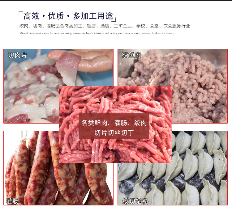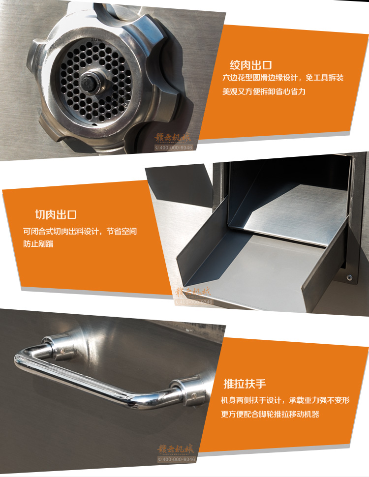 本機采用304不銹鋼板材封裝設計,絞肉十字刀、絞龍及圓刀采用201不銹鋼材質,切肉刀采用特殊加硬鋼材,激光開刃鋒利耐用,雙滾切肉效果好,肉片規則均勻。不銹鋼絞龍絞齒深,咬力更大,絞肉更強勁,離合開關設計,操作方便耐用。
