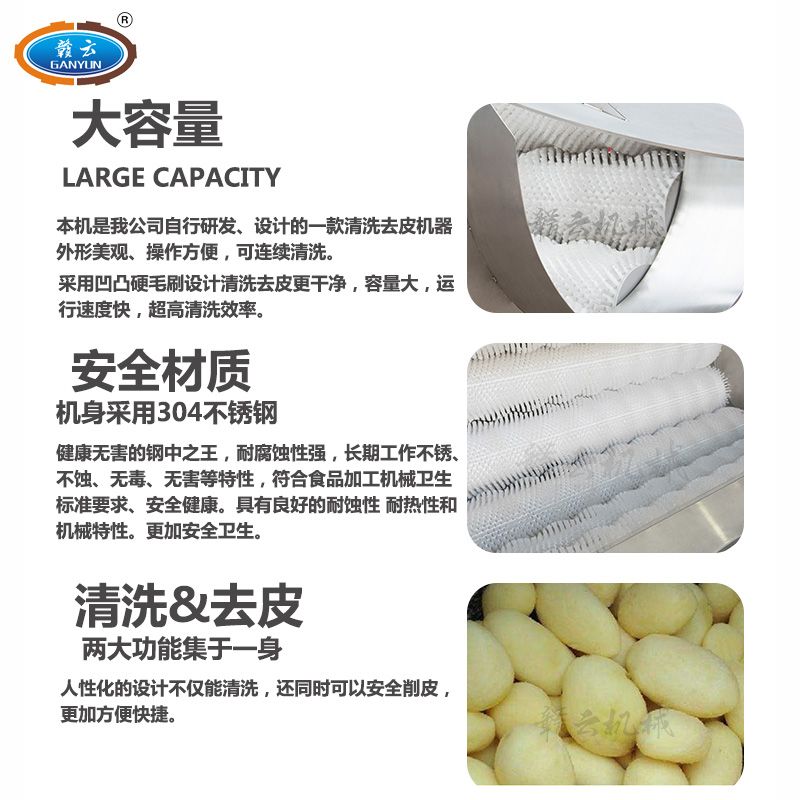 加高毛輥清洗機是我公司自行研發、設計的一款清洗去皮機器,外形美觀,操作方便,可連續清洗。采用凹凸硬毛刷設計,清洗去皮更干凈,容量大,運行速度快,超高清洗效率。機身采用304不銹鋼材質,健康無害耐腐蝕性強,長期工作不銹、不蝕、無毒、無害等特性,符合食品加工機械衛生標準要求、安全健康。具有良好的耐蝕性,耐熱性和機械特性。更加安全衛生。清洗加去皮,兩大功能集于一身,人性化的設計,清洗的同時還能去皮。 本產品屬于定制產品,需要定制請聯系我們的客服哦!