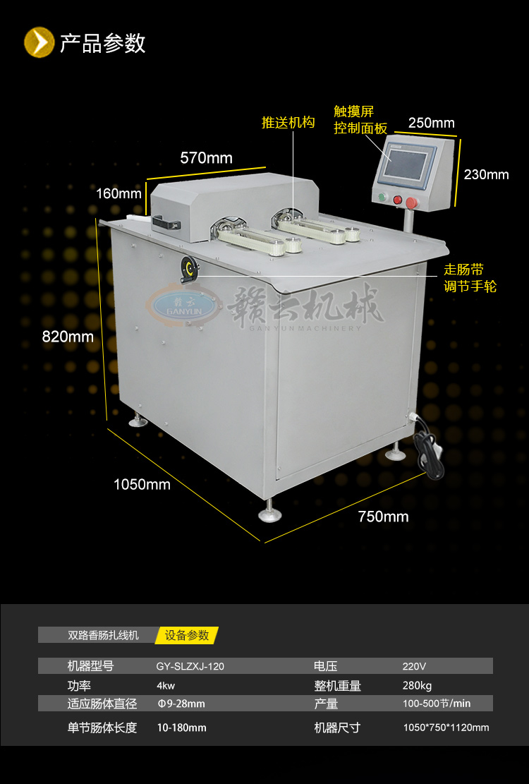 全自動動雙路高速香腸扎線機,自動分份,自動繞線,全程自動化控制。該機采用了優質電機和本公司自主研發的控制系統,機身全不銹鋼制造、效率高、易操控、節約生產原料等優點,產品長度的調節可以隨心所欲