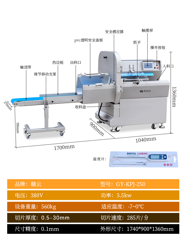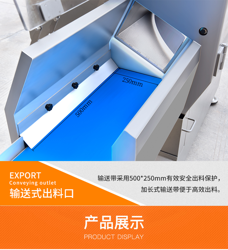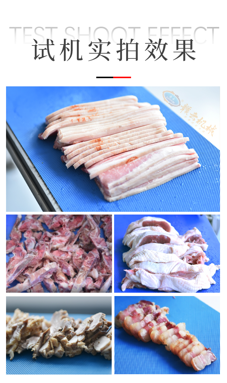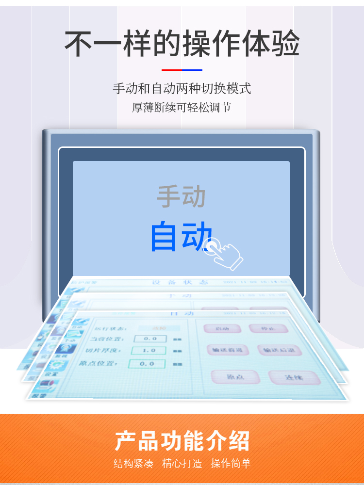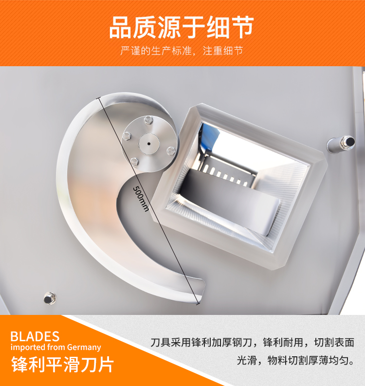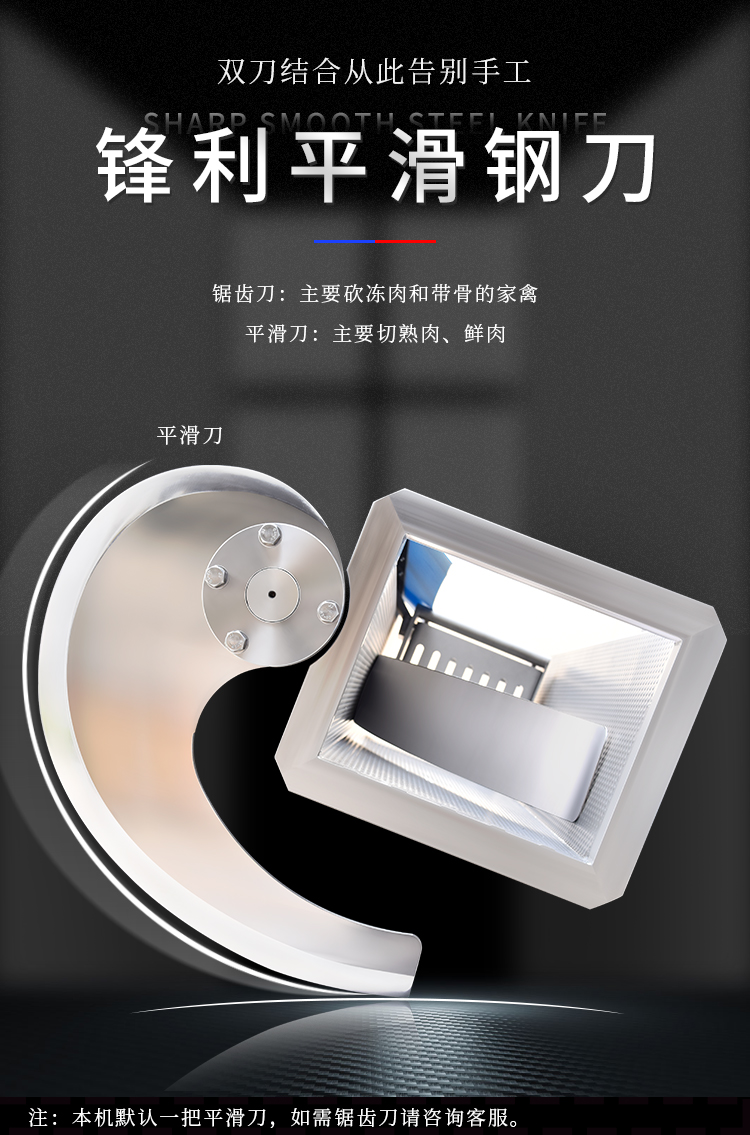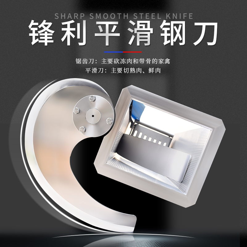 機器采用鋒利加厚鋼刀,鋒利耐用,平滑刀主要用于切熟肉和鮮肉,鋸齒刀主要用于砍凍肉和帶骨的家禽,機器默認配置平滑刀。機器采用手動和自動兩種切換模式,并且厚薄斷續可輕松調節。