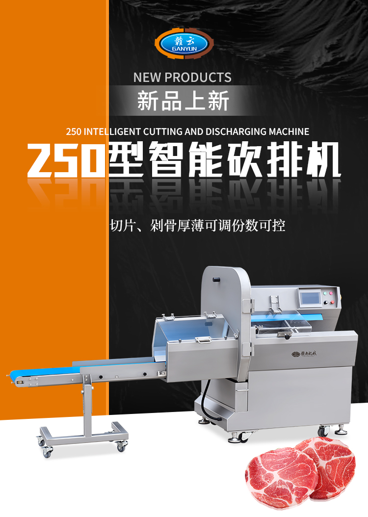 250型智能砍排機,新品上市,你還在手工剁骨頭?,手工剁骨頭大小不一,效率低下,骨頭不好穩定固定,要有力氣還得有技術,贛云250型砍排機讓你告別傳統菜刀,解放雙手,只要一款機器,可以滿足多種食材切片、骨類切塊。