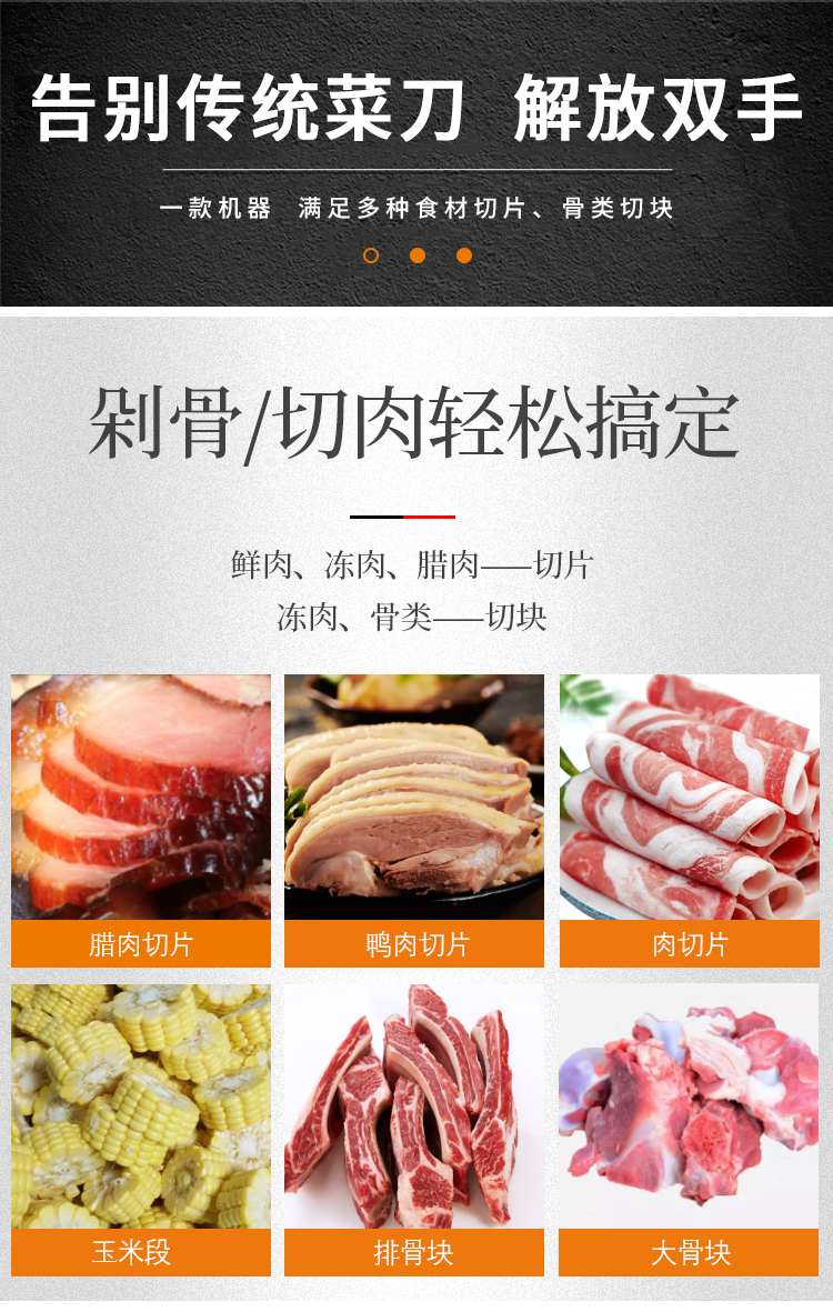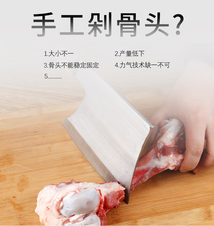 讓你剁骨/切肉都通通輕松搞定的多功能砍排機:鮮肉、凍肉、臘肉都可以切片,也可以對凍肉、大骨頭、排骨、玉米切塊或切段。