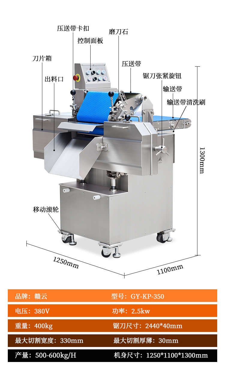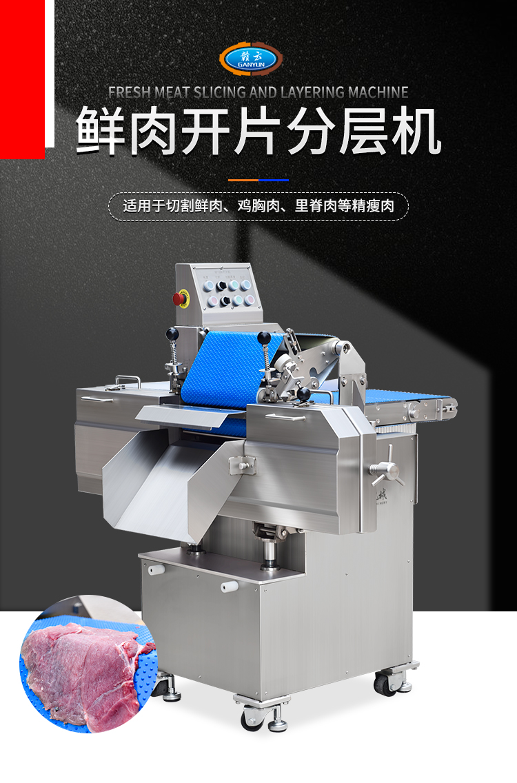贛云350鮮肉開片分層機,全自動分層機,適用于切割鮮肉、雞胸肉、里脊肉、瘦肉等肉制品加工切片的設備,切肉片機器使用不銹鋼材質,環形切刀,厚薄可調,切肉機分層機增加了小型輸送線,多功能切肉片機器適用于肉制品加工廠,中央廚房設備中。
