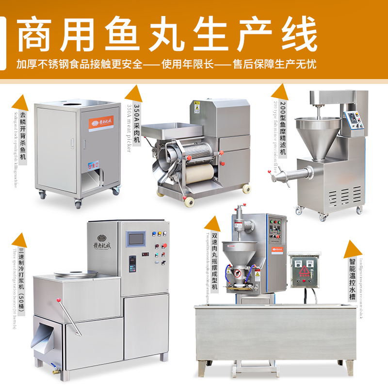 本套魚丸設備包含:殺魚機、魚肉采肉機、魚肉精濾機、三速制冷打漿機、搖擺肉丸機、雙溫控加熱水槽。操作步驟是先將活魚通過殺魚機,先開肚去魚鱗,然后將殺好的魚通過分切后,進入魚肉采肉機進行魚肉魚刺分離。若需要提升魚丸的品質,建議將采集好的魚肉, 通過魚糜精濾機將魚肉中的魚筋、魚血、魚皮等在次進行過濾出來,經過這一步驟得到的魚肉品質就很高。將已經精濾過的魚肉通過三速制冷打漿機進行打漿和配料。最后將打好的魚漿通過搖擺肉丸機進行成型和定型熟化。