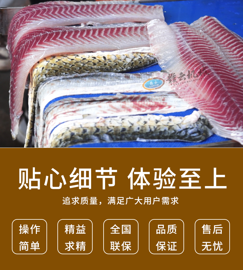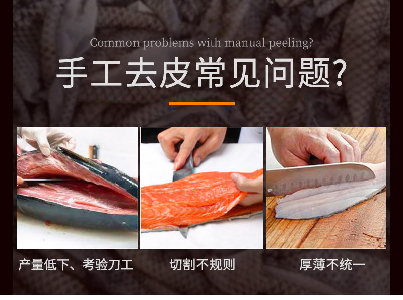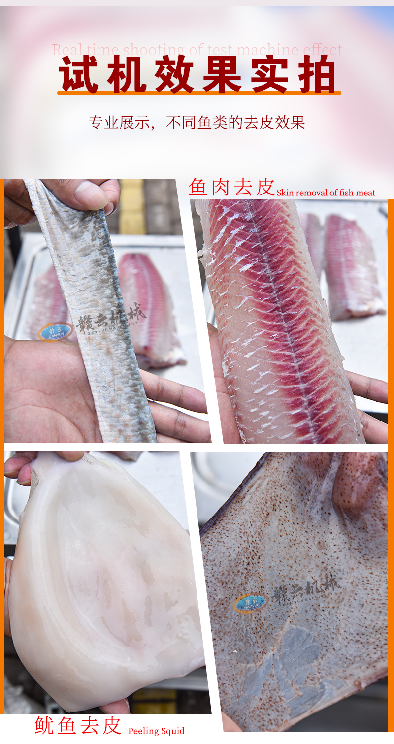 適用于草魚、鯰魚、鱈魚、三文魚、魷魚、羅非魚等多種水產魚類的去魚皮和去除魚紅,去皮效果干凈,提升魚肉品質。