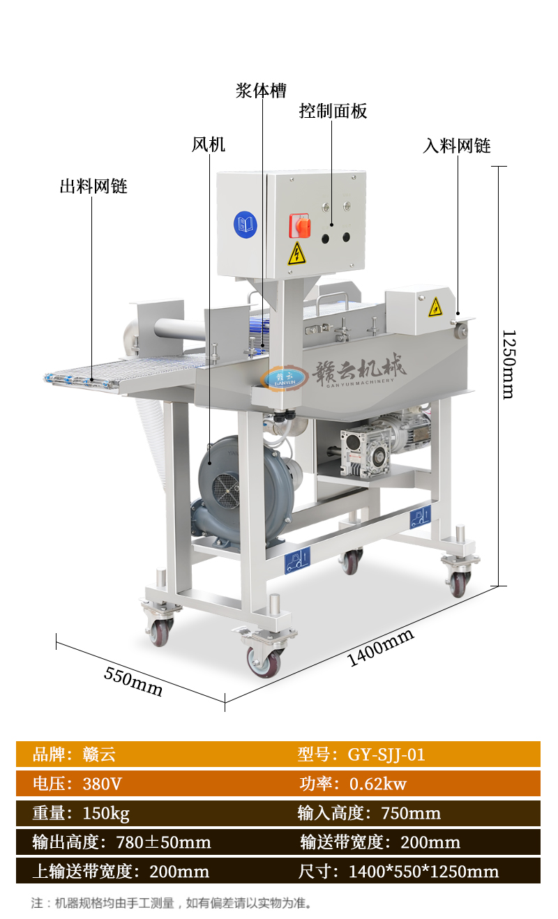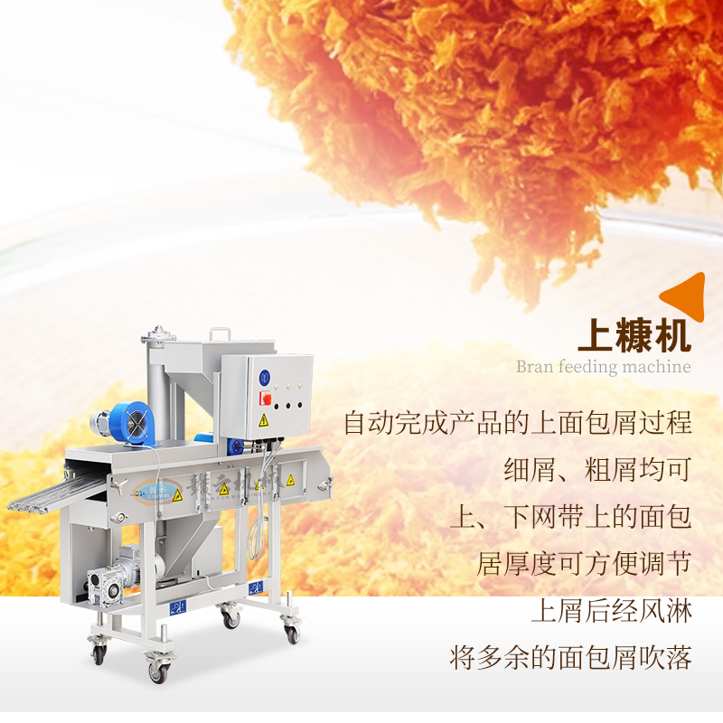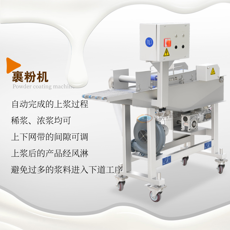 用于雞排、肉餅、魚排、牛排等各種油炸食品的快速自動上漿裹粉。