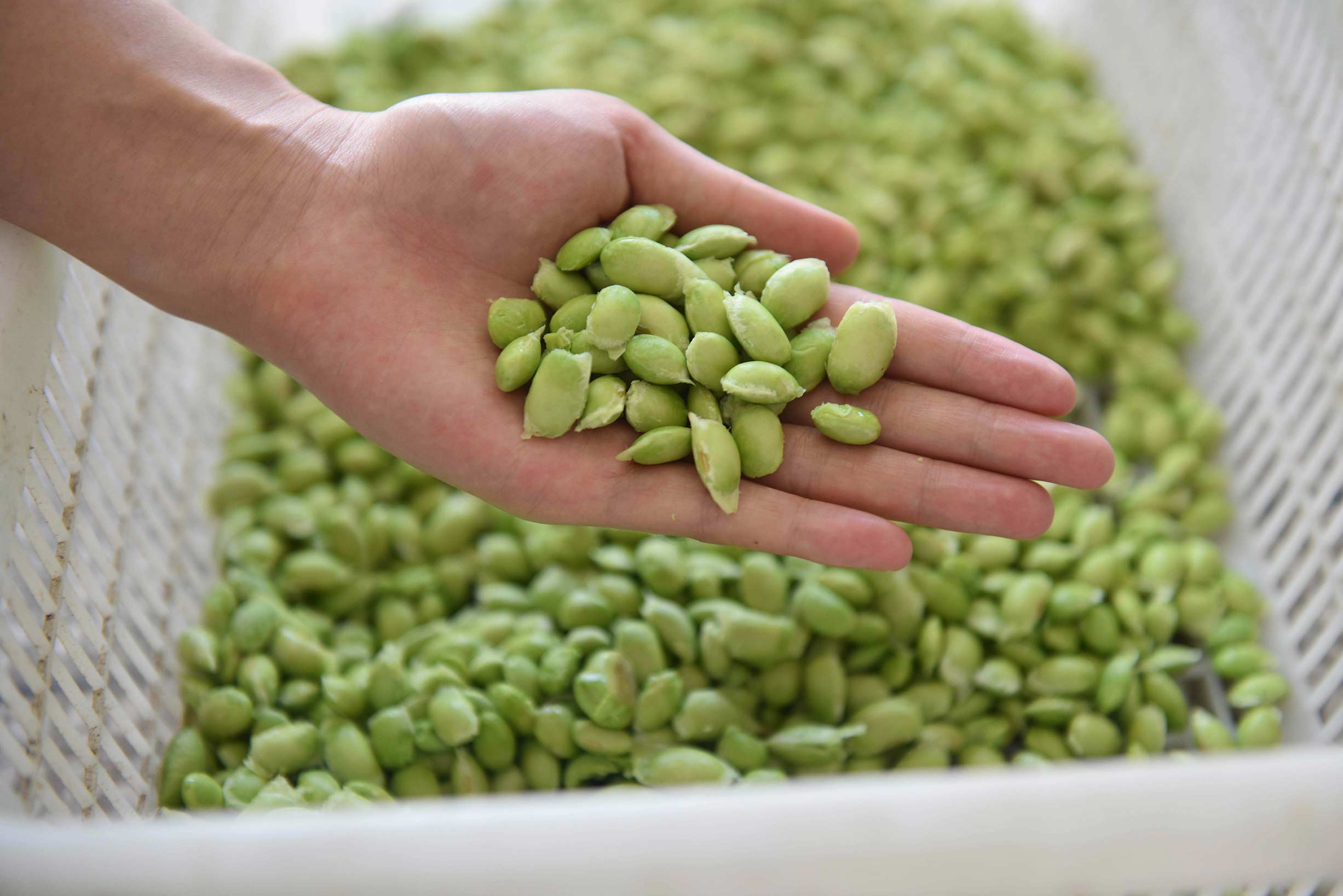 另一款是毛豆脫皮機,這款機器的特點是剝出來的毛豆帶衣,顆粒飽滿。以下是試機效果