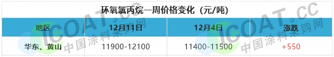 國內環氧氯丙烷市場止跌反彈,12月11日,華東市場環氧氯丙烷價格在12000元/噸附近。聽聞寧波環洋兩條線共6萬噸/年甘油法環氧氯丙烷裝置負荷穩定,廠家新單暫無明確報盤,廠家計劃15日開始停車,約25天。