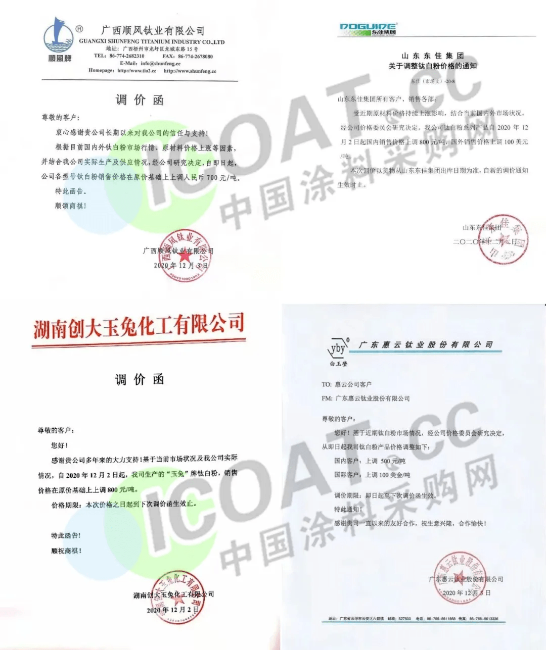 2020年12月1日起,鈦白市場再次掀起新一波漲價潮。據不完全統計,目前已有近20家主流鈦白廠商發布漲價通知,其中包括龍蟒佰利聯、攀鋼、海峰鑫、山東道恩、廣西順風等。此次調價鈦白企業調價幅度多為700-1000元,且已經開啟了全年第8輪調價,累計調漲最高5300元/噸。