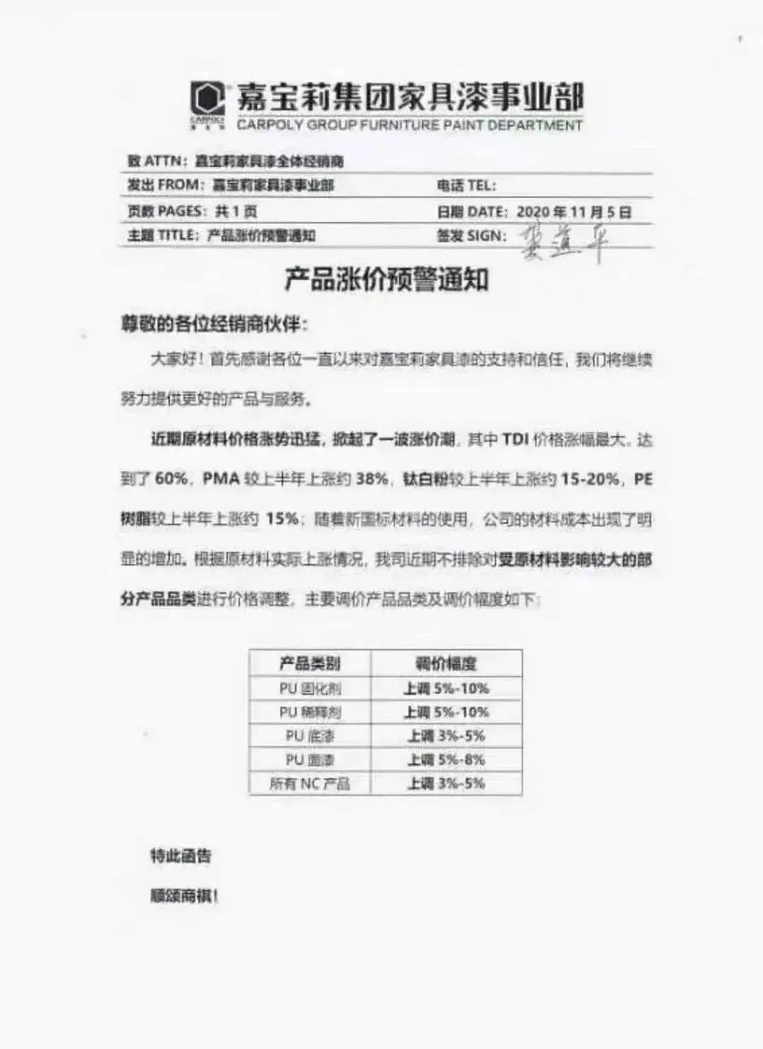 早在今年11月3日,以重防腐涂料為主營業務的無錫福斯特涂料有限公司則對外發布調價通知函,宣布:于2020年11月3日起在現售價基礎上:溶劑型涂料上調10%,水性涂料上調5%,其余系列產品全部上調5%。