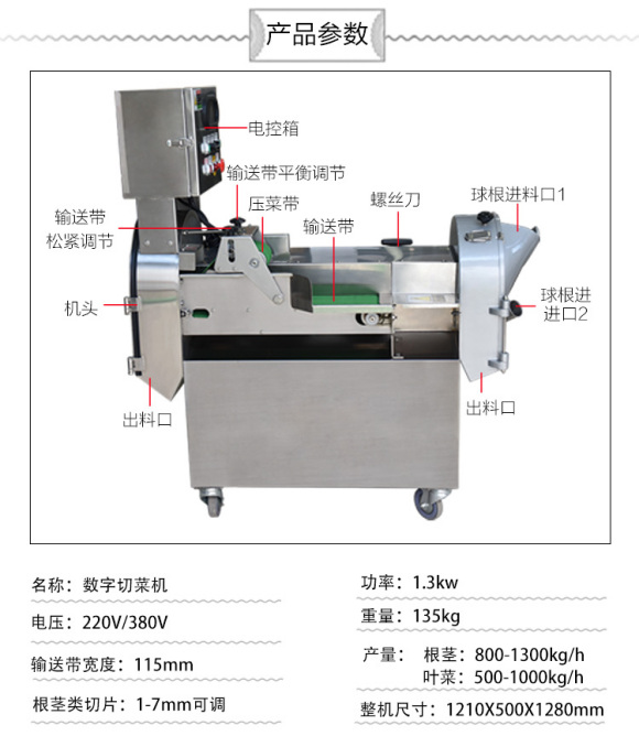 ②數字切菜機,多功能切菜機,雙機頭控制切菜,不僅可以加工葉菜類,還可以加工球根莖類蔬菜,切片切絲切丁使用。