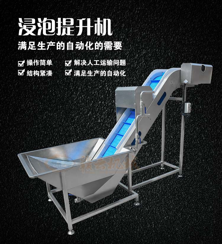 本機主要起提升和輸送的作用,浸泡清洗機是由水箱和提升機組合而成的機械,物料先倒入水槽后浸泡,在由提升機進行提升給下一道工序。解決人工入料困難的問題;在流水生產線中,該設備通常和其他入料口要求高的設備搭配使用,滿足生產的自動化的需要。該機具有操作簡便、結構緊湊、造型美觀、維修方便等優點。