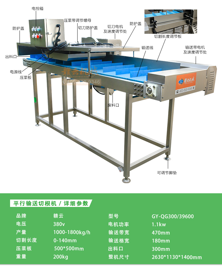平行輸送去根機由輸送板帶動物料前行,蔬菜經(jīng)過固定位置的刀盤后,蔬菜根部被切割從廢料口出來,保留的蔬菜則向前輸送。切割的長度可以調(diào)節(jié),每顆蔬菜所切割出來的廢料都相等。去根機適合大型食品加工廠、凈菜生產(chǎn)線等。