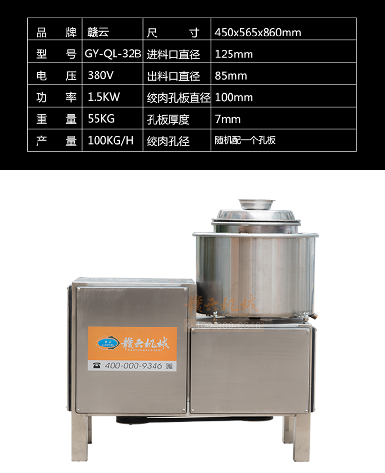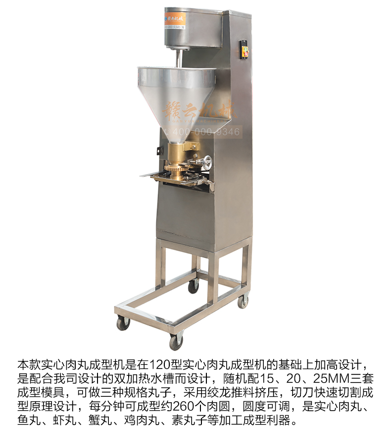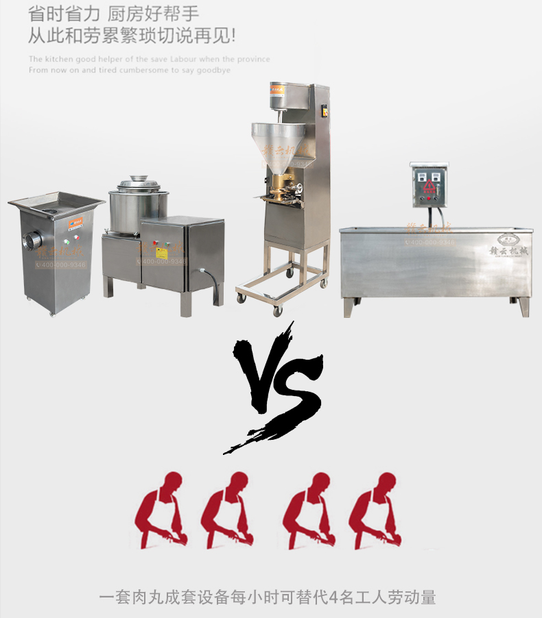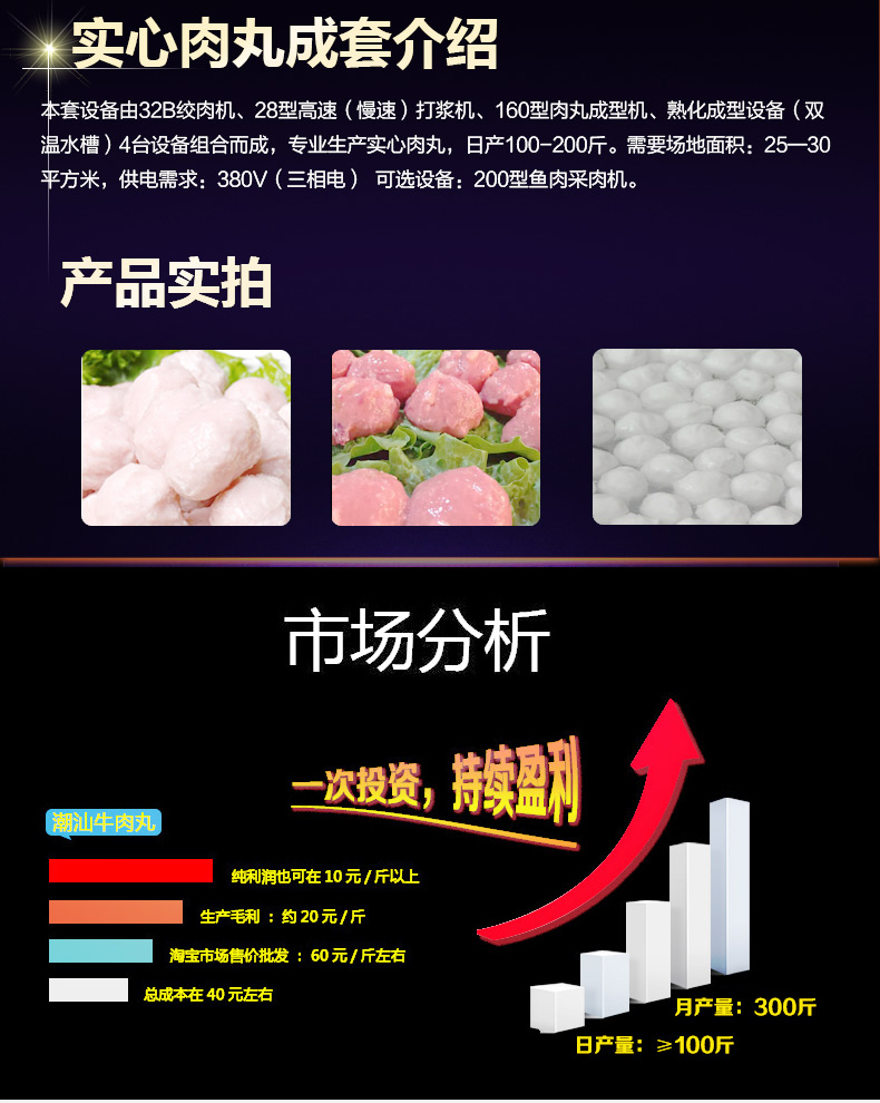 本套設備由32型絞肉機、28型高速(慢速)打漿機、加高成型機、熟化成型設備(雙溫水槽)4太設備組合而成,專業生產實心肉丸,日產100-200斤。需要場地面積:25-30平方米,供電需求:380v(三相電)可選設備:200采肉機