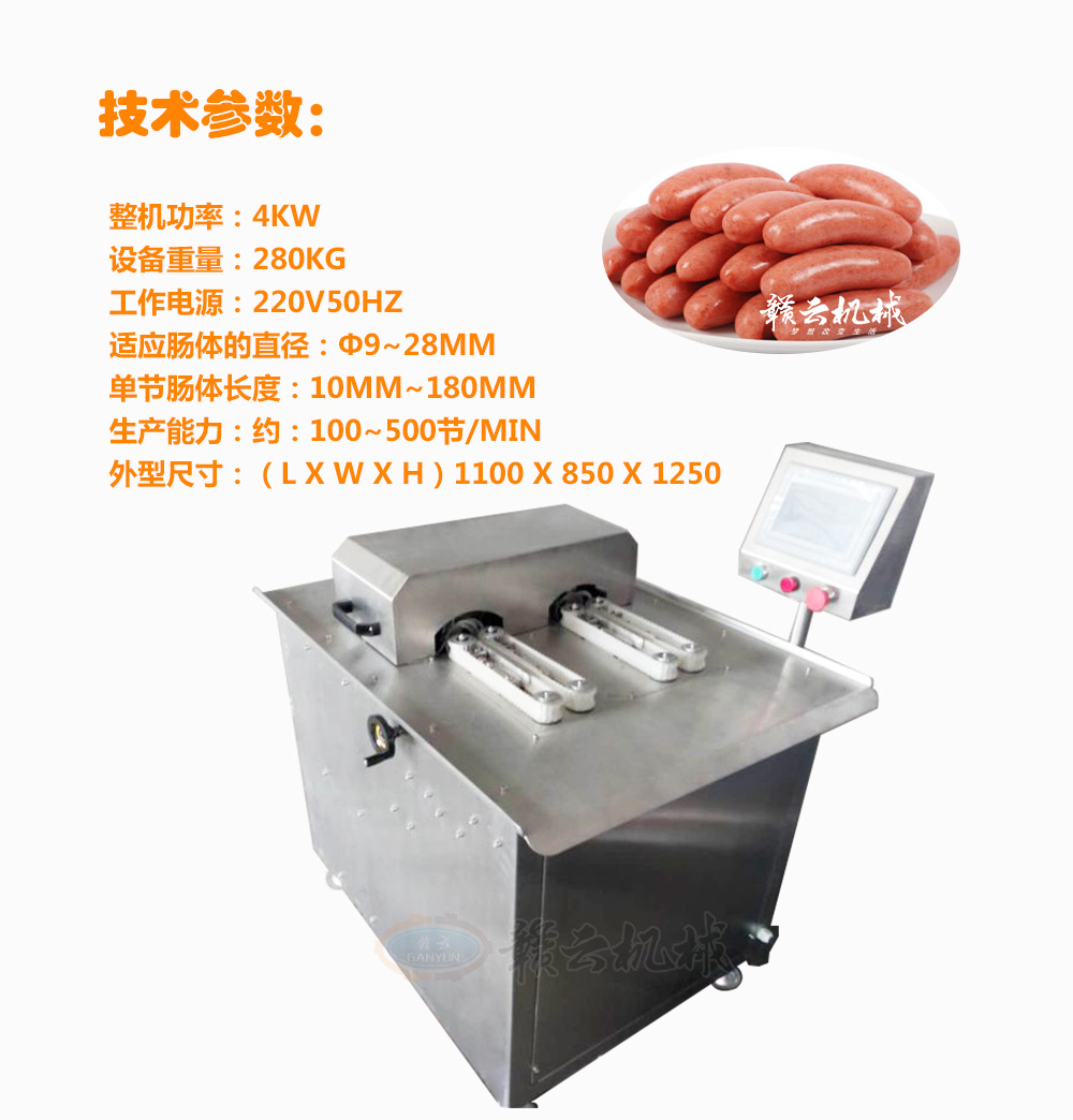 全自動雙路高速香腸扎線機(jī),自動分份,自動繞線,全程自動化控制。該機(jī)采用了優(yōu)質(zhì)電機(jī)和本公司自主研發(fā)的控制系統(tǒng),機(jī)身全不銹鋼制造、效率高、易操控、節(jié)約生產(chǎn)原料等優(yōu)點(diǎn),產(chǎn)品長度的調(diào)節(jié)可以隨心所欲
