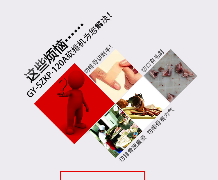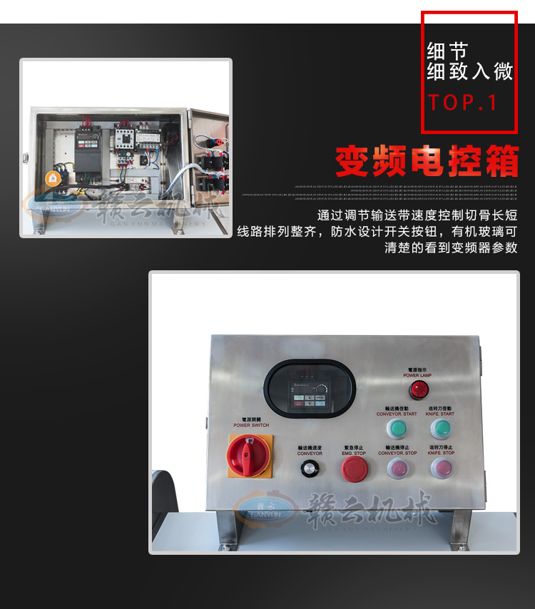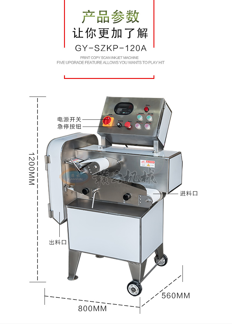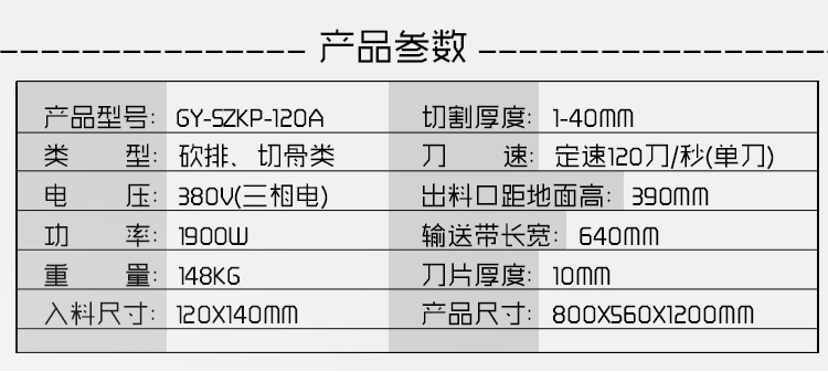 GY-SZKP-120A砍排機,優(yōu)質(zhì)刀片。通過調(diào)節(jié)輸送帶速度控制切骨長短線路排列整齊,防水設(shè)計開關(guān)按鈕,有機玻璃可清楚的看到變頻器參數(shù)。壓菜帶根據(jù)不同的需求調(diào)節(jié)不同的高度,輸送帶采用PVC材質(zhì),可拆卸更換輸送帶,拆卸方便。優(yōu)質(zhì)刀片,杜絕卷刃。機身背面散熱孔設(shè)計,電機運作時散發(fā)熱量,散熱孔設(shè)計更有效的保護電機的壽命,出料口傳感器設(shè)計,機器運作時打開刀盤門機器停止運作,安全穩(wěn)定,人性化設(shè)計。