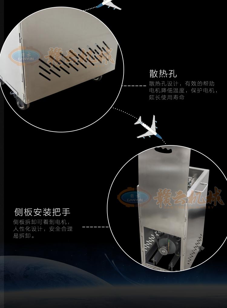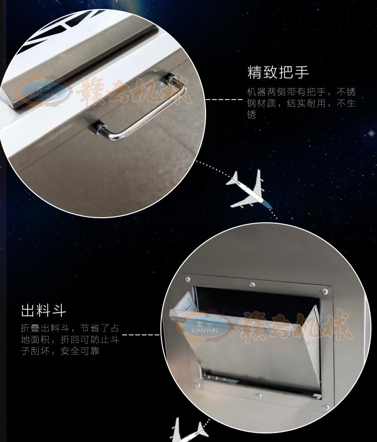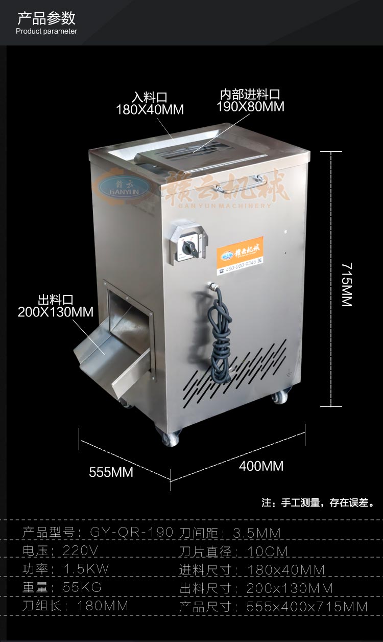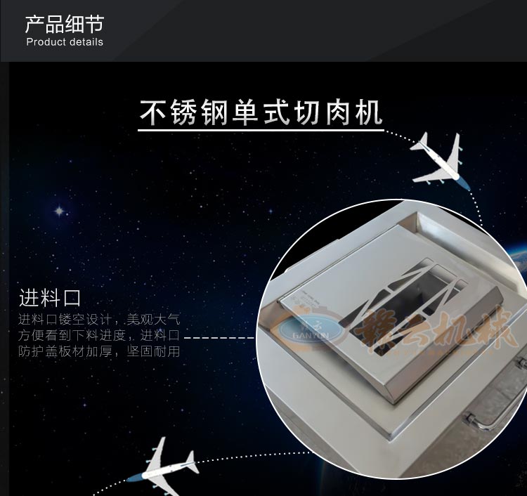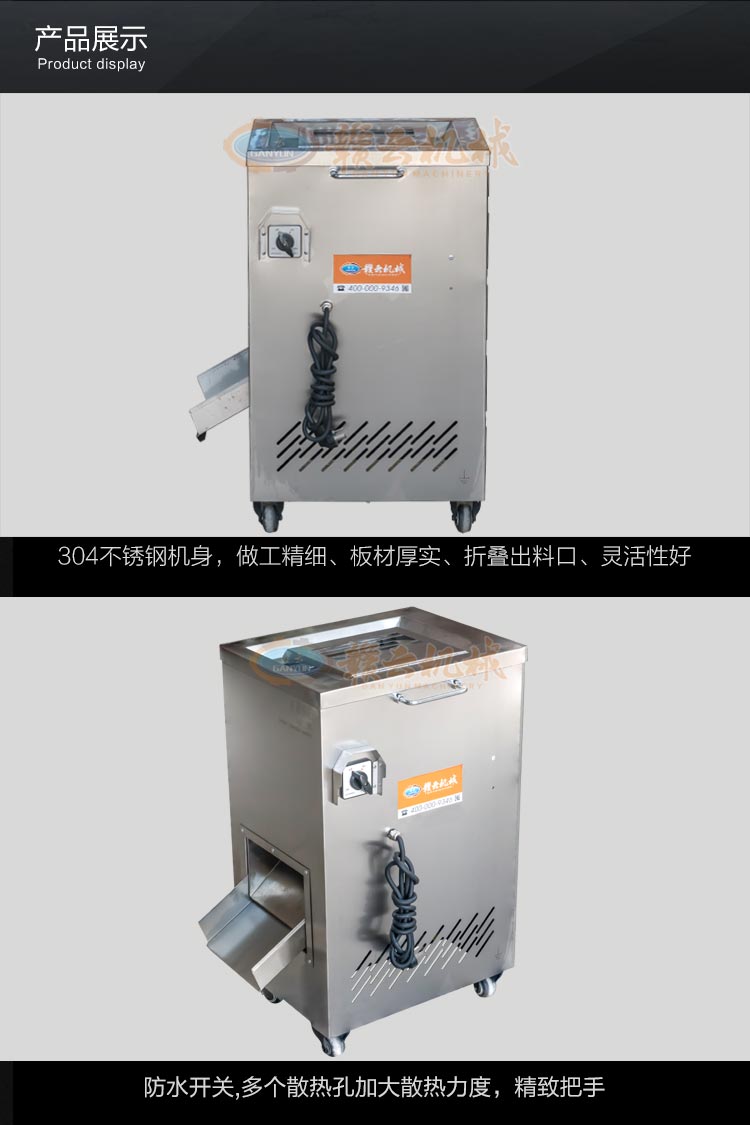 不銹鋼切肉機(jī)不銹鋼切肉機(jī),進(jìn)料口鏤空設(shè)計(jì),方便看到下料進(jìn)度,進(jìn)料口防護(hù)蓋板材加厚,堅(jiān)固耐用。鋒利刀片,刀間距3.5mm,切切肉片、肉絲、肉粒。防水旋鈕開(kāi)關(guān)。折疊出料口,節(jié)省空間,推回可防止料斗刮壞。側(cè)板拆卸可看到電機(jī)。304不銹鋼機(jī)身,兩個(gè)萬(wàn)向輪,兩個(gè)非萬(wàn)向輪,容易固定,省心。