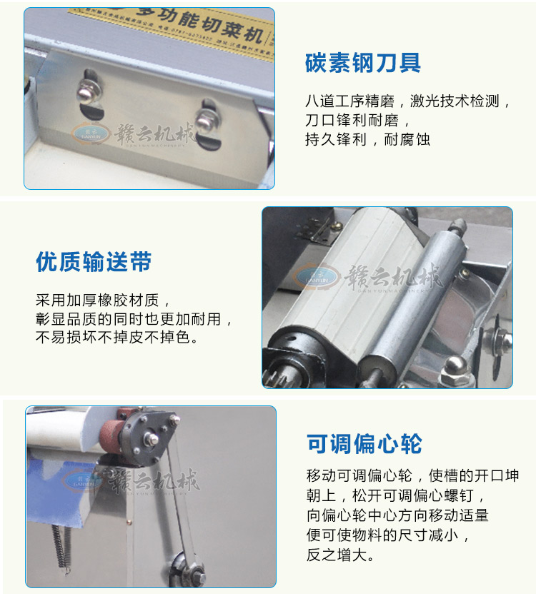 贛云牌多功能切菜機是根據多種樣機在實地使用中存在不足之處,反復改進設計制造,采用不銹鋼和全滾動軸承結構,具有外形美觀,成熟可靠,使用維修方便等特點。適用直蔬菜脫水、速凍、保鮮、腌漬等食品行業各類蔬菜。刀片距離可調節在0.1cm-2cm之間即切片、丁、絲厚薄在0.1cm-2cm。