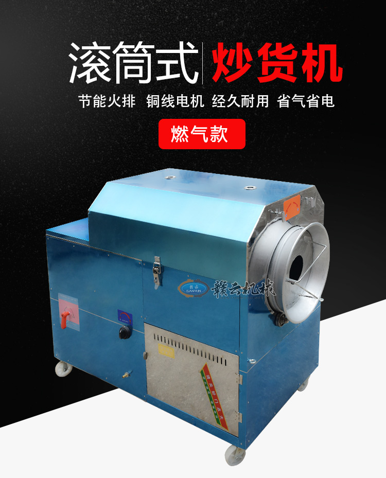 多功能炒貨機集各種大中小型炒貨機的優點為一體,可使用液化氣或燃煤作為加熱源,自動旋轉、自動翻炒、自動出鍋,整機采用優質不銹鋼板加工成形,外觀豪華氣派,美觀大方,清潔衛生,機器采用了先進的滾筒臥式結構,滾筒加熱均勻,并有保溫功能 , 工作時滾筒不停地旋轉,使炒貨食品上下、左右、前后、全方位立體翻炒,不會出現粘鍋現象,炒制出的食品色澤金紅亮麗,香氣撲鼻。