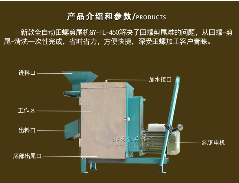 新款全自動(dòng)田螺剪尾機(jī)GY-TL-450解決了田螺剪尾難的問題,從田螺-剪尾-清洗一次性完成,省時(shí)省力,方便快捷,深受田螺加工客戶青睞。