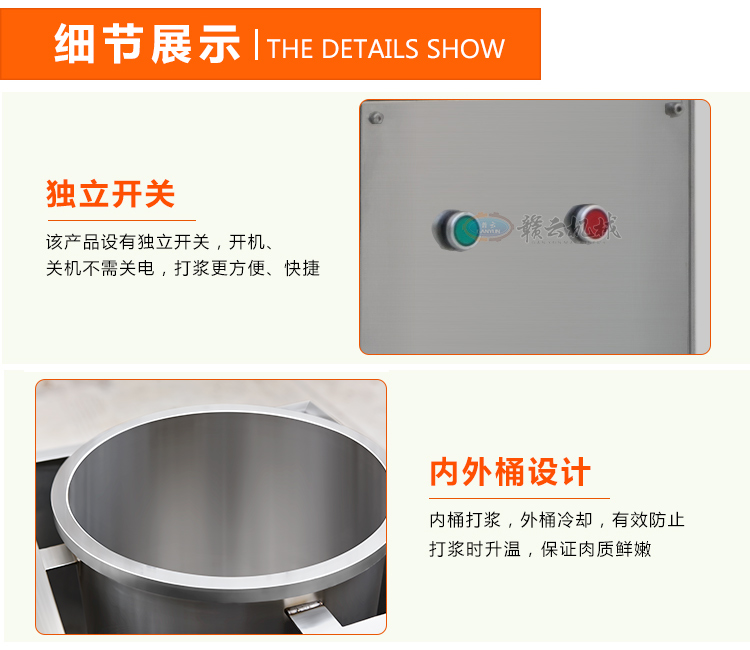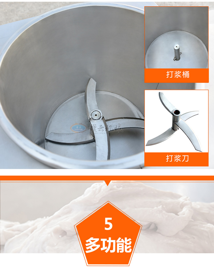 高速打漿機選用全不銹鋼制作,開機2-3分鐘即可完成打肉、配料,攪拌成漿。針對魚肉豬肉的纖維組織,高速生產過程中改善了肉質脂肪纖維,生產出的丸子外表光滑細嫩、低脂、口感爽脆,彈性好,韌性好,是潮州魚、肉丸的專用打漿設備。此款肉丸高速打漿機還可以連續投料打漿,效率高,打漿效果好,根據肉丸生產產量需求可定做,因此深受肉丸加工廠家青睞設備!