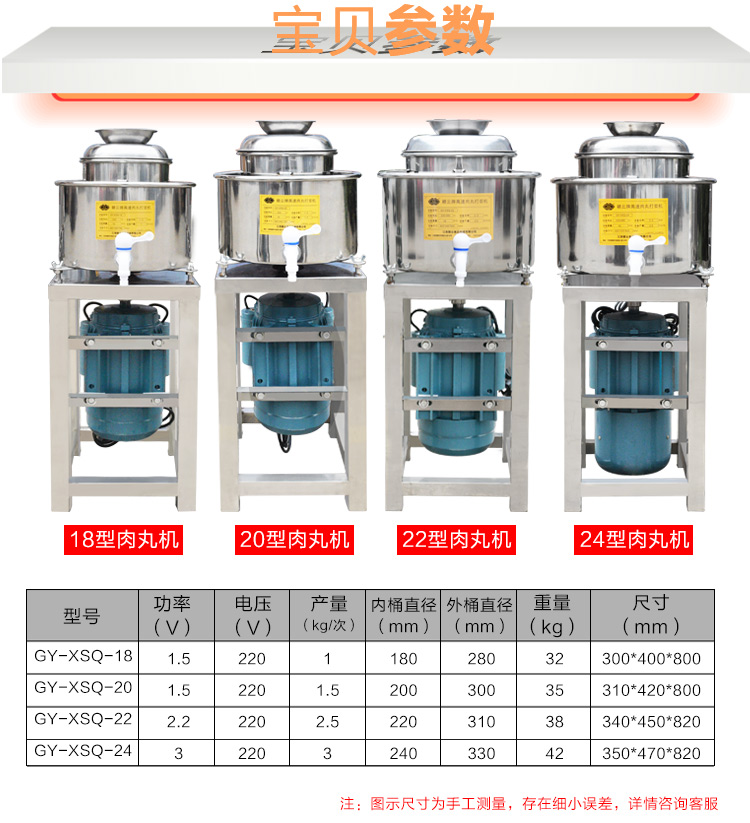 贛云牌新款全不銹鋼肉丸機,18型肉丸機采用全不銹鋼材質,在舊款全不銹鋼肉丸機的基礎上給支撐架加粗加厚,用不銹鋼蓋,打漿雙桶,刀柄刀片均采用不銹鋼材質。打漿桶裝肉量1L,一次可打肉漿1-2斤左右,采用2800r/min高速電機,故稱之為高速肉丸機。