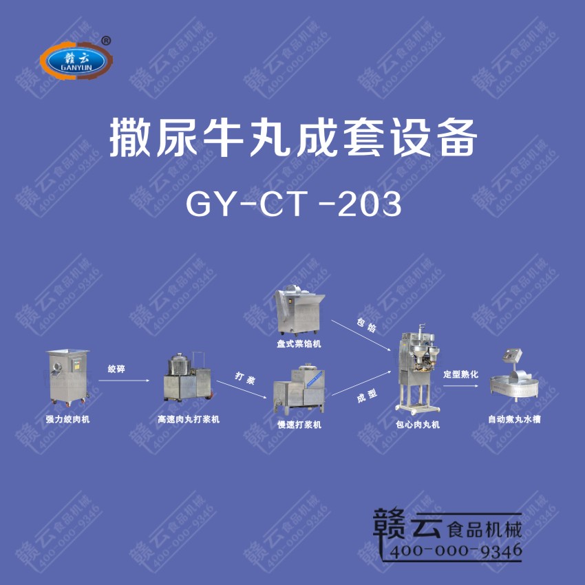 GY-CT-203系列撒尿牛丸成套設備由:32型強力絞肉機、28型全封閉式傳動高速肉丸打漿機、32型慢速肉丸打漿機、300型盤式菜餡機、第二代包心肉丸機和自動煮丸水槽六臺設備組合而成。
