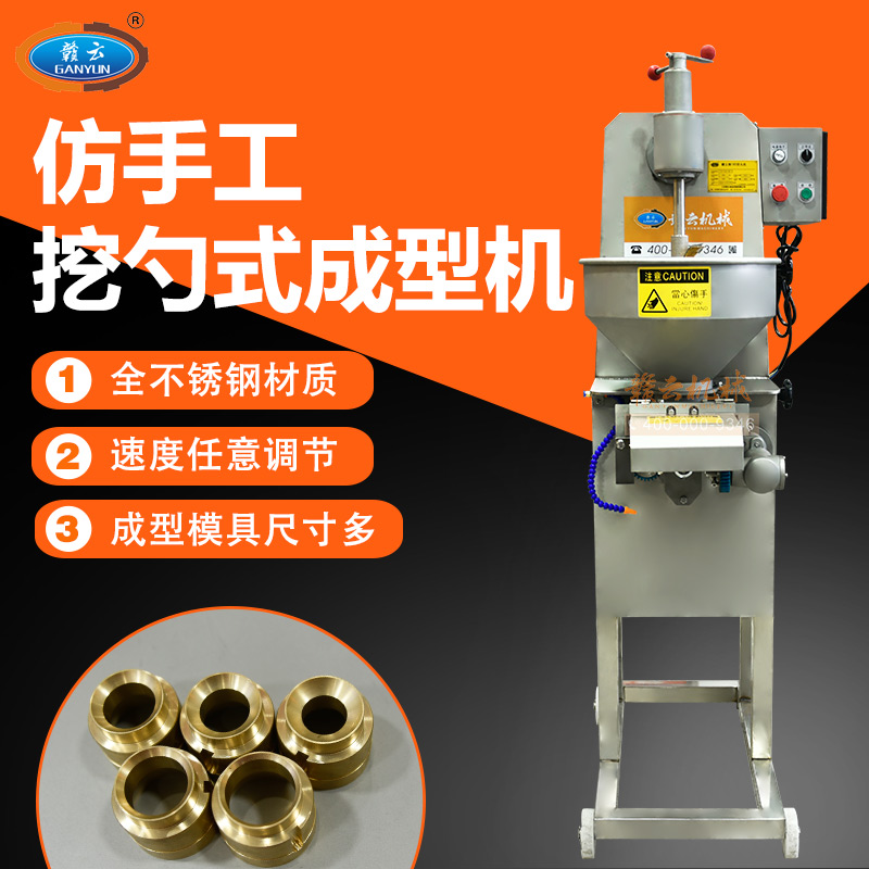 全自動仿手工擠丸挖式成型機,又稱墨魚丸成型機或高速貢丸成型機,是一款完全仿手工用匙子成型的設備。不同于普通成型機的刀片切割,用開明型鋼勺自動舀挖出丸子,做出丸子具有彈性好,圓度好、外表皮光滑或保持原漿體顆粒,還可以拔層的特點,。特別在做貢丸和牛肉丸這些有肉筋的丸子的時更能顯示其顯著的性能。