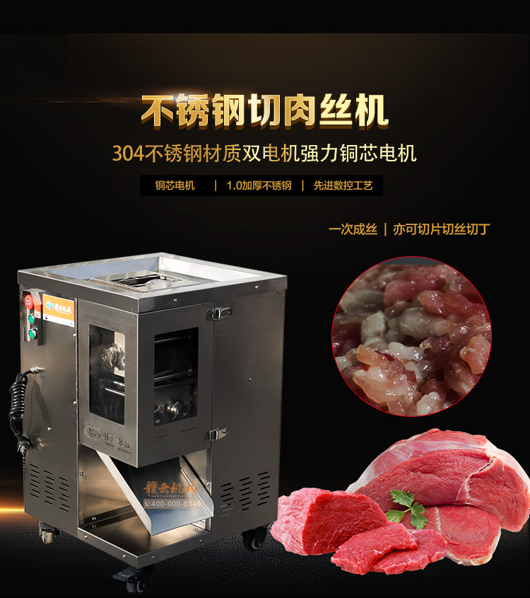 整機采用304不銹鋼板材封裝設計,板材標準1mm厚,刀片采用特質材質雙滾切刀,鋒利耐用,雙電機分別控制垂直刀組切割肉類,可一次成絲,可免工具拆卸清洗刀組,切肉速度快,力度強,切絲規格均勻