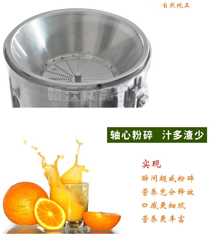 贛云為您提供3000型不銹鋼果蔬榨汁機,該機可榨各類水果,少量蔬菜,如黃瓜、西紅柿、胡蘿卜、生姜等,出汁率比普通的榨汁機要高。新采用軸心粉碎技術,汁多渣少,離心分離渣汁,給你一口原汁原味的感覺。