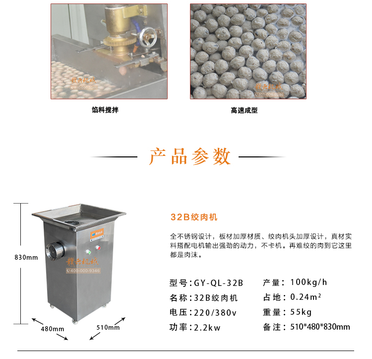 本套設備有:32B型強力絞肉機、28型傳動式高速肉丸打漿機、 160型實心丸子成型機和雙槽加熱水槽四臺設備組合而成,均是目前市上新款式設備,效果突出,做出的肉丸圓、有彈性、口感好,加工速度快等特點深受豬肉丸丸子加工客戶睞,500KG左右。