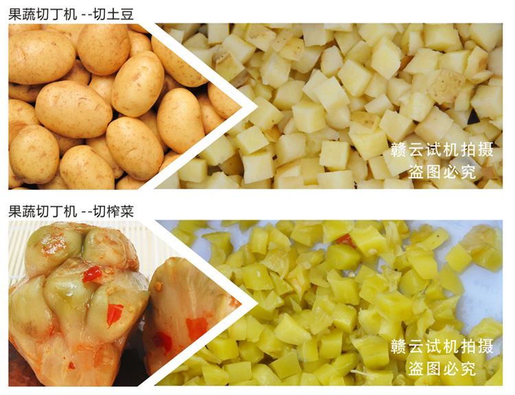 130型果蔬切丁機采用不銹鋼材質和鋁合金設計而成,利用物料的離心作用力作用于切片刀、切絲刀和切丁刀上,可一次切出規則的丁狀物,亦可將切絲刀和切丁刀拆卸下來,切片和切條。適用范圍廣,適用于食堂,食品加工廠等切片切絲切丁之用,以節約人工成本,提升產能。