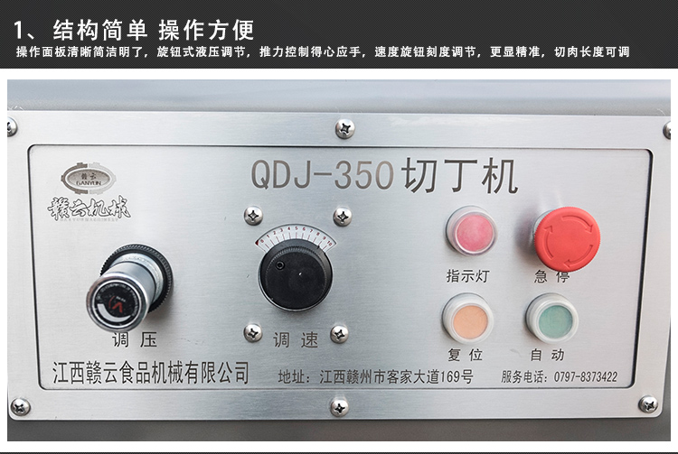 贛云350型切肉丁機,采用304不銹鋼噴砂處理技術,裝備優質刀組,利用流水線條設計,配合激光雕刻控制面板,整體外形美觀大氣。液壓步進式推料自動切割,推料速度旋鈕可調,拆增刀片可切出多種規格肉丁、肉條、肉片。是肉類食品加工切丁專用設備。