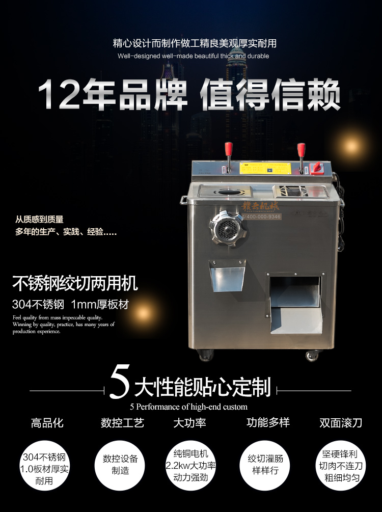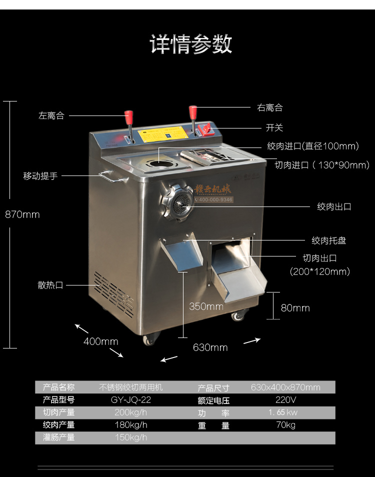 贛云2017款304不銹鋼絞切機上市,火熱開賣中,裝配2.2kw 大功率純銅電機,采用1mm標準厚304不銹鋼板材封裝,離合開關設計,絞肉切肉一體。適合高端酒店場所之用,同樣也適合品質優質店鋪和檔口絞肉切肉之用。十二年品質保證,值得擁有!