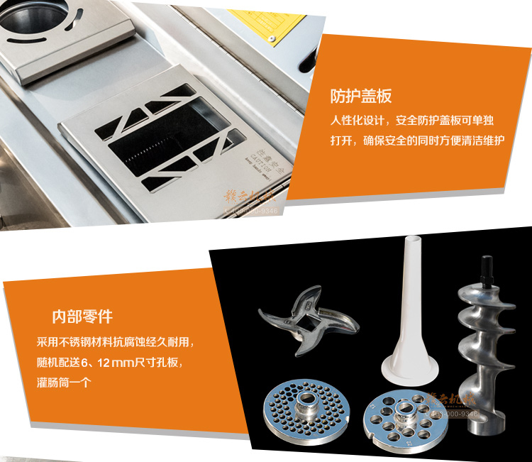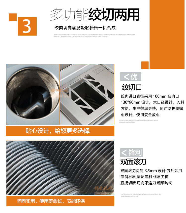 本機采用304不銹鋼板材封裝設計,絞肉十字刀、絞龍及圓刀采用201不銹鋼材質,切肉刀采用特殊加硬鋼材,激光開刃鋒利耐用,雙滾切肉效果好,肉片規則均勻。不銹鋼絞龍絞齒深,咬力更大,絞肉更強勁,離合開關設計,操作方便耐用。