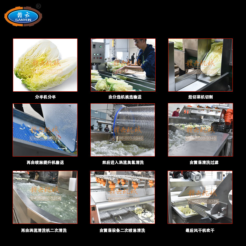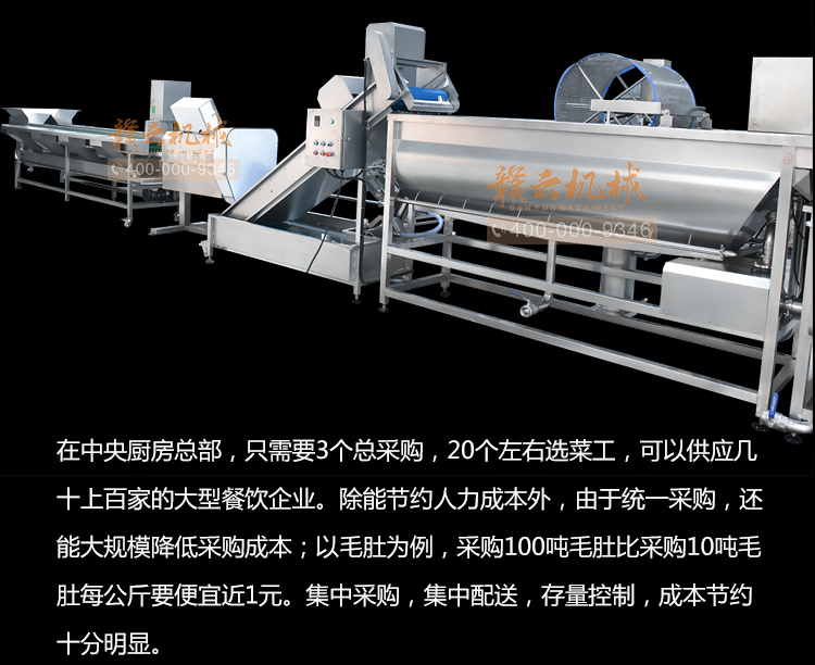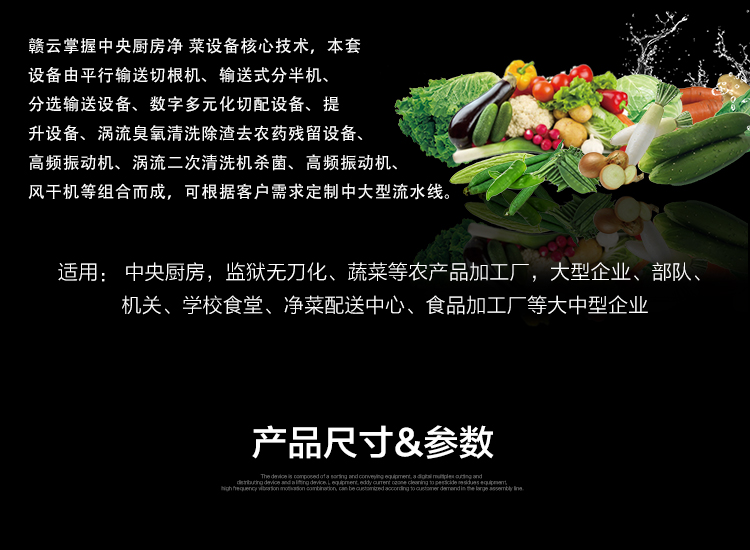 中央廚房凈菜設備流水線_食堂凈菜加工流水線_食堂切配成套設備_贛云掌握中央廚房凈菜設備核心技術,本套設備由分選輸送設備、數字多元化切配設備、提升設備、渦流臭氧清洗去農藥殘留設備、高頻振動機組合而成,可根據客戶需求定制中大型流水線。