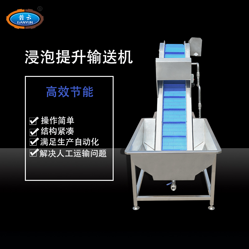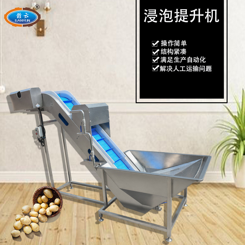 本機主要起提升和輸送的作用,浸泡清洗機是由水箱和提升機組合而成的機械,物料先倒入水槽后浸泡,在由提升機進行提升給下一道工序。解決人工入料困難的問題;在流水生產線中,該設備通常和其他入料口要求高的設備搭配使用,滿足生產的自動化的需要。該機具有操作簡便、結構緊湊、造型美觀、維修方便等優點
