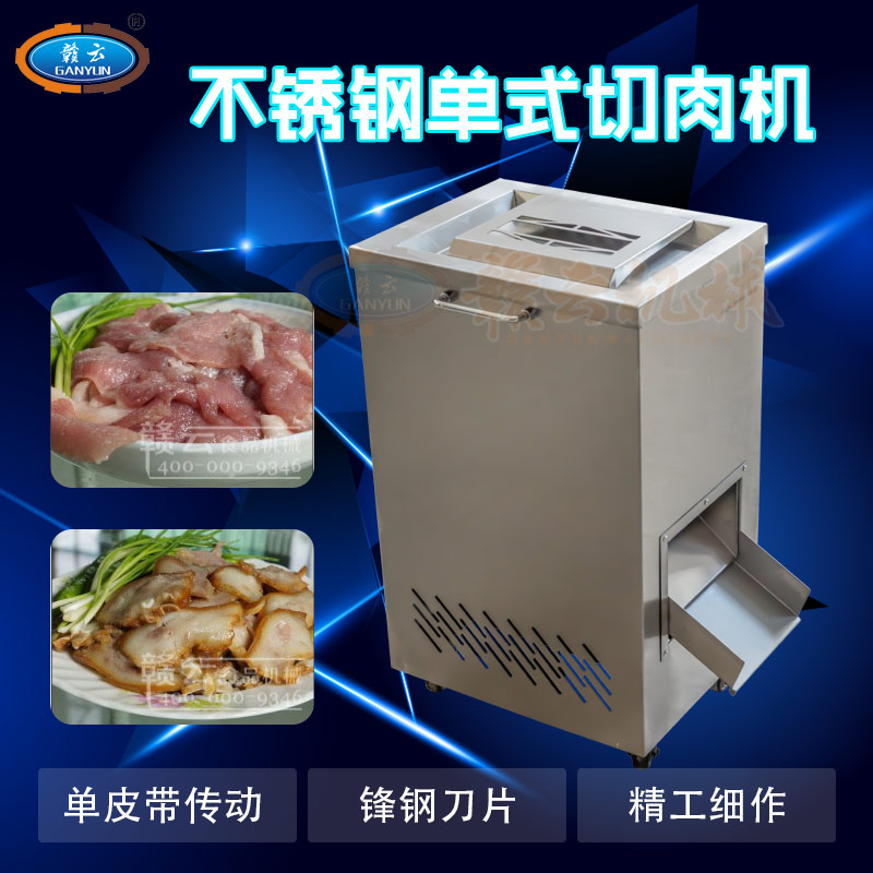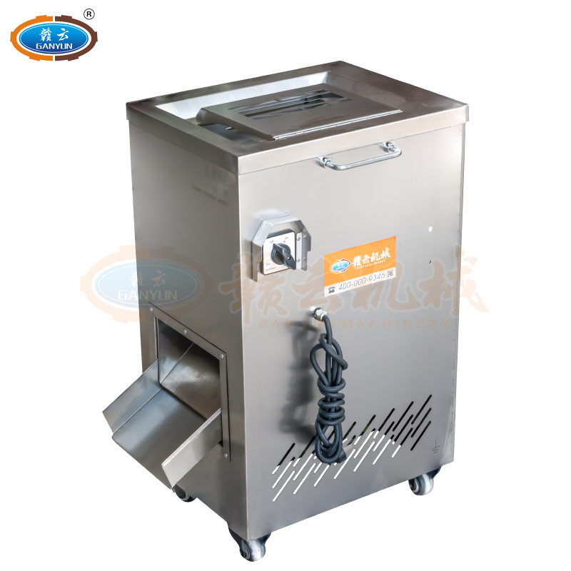 不銹鋼切肉機不銹鋼切肉機,進料口鏤空設計,方便看到下料進度,進料口防護蓋板材加厚,堅固耐用。鋒利刀片,刀間距3.5mm,切切肉片、肉絲、肉粒。防水旋鈕開關。折疊出料口,節省空間,推回可防止料斗刮壞。側板拆卸可看到電機。304不銹鋼機身,兩個萬向輪,兩個非萬向輪,容易固定,省心。