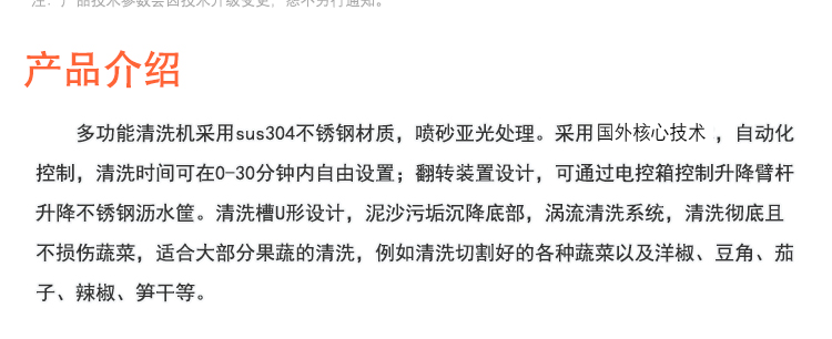 多功能清洗機,采用sus304不銹鋼材質,噴砂亞光處理。采用先進技術,自動化控制,清洗時間可在0-30分鐘內自由設置;翻轉裝置設計,可通過電控箱控制升降臂桿升降不銹鋼瀝水筐。清洗槽U型設計,泥沙污垢沉降底部,渦流清洗系統,清洗徹底且不損傷蔬菜,適合大部分果蔬的清洗,例如清洗切割好的各種蔬菜以及洋椒、豆角茄子、辣椒、筍干等。