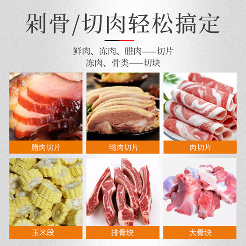 讓你剁骨/切肉都通通輕松搞定的多功能砍排機:鮮肉、凍肉、臘肉都可以切片,也可以對凍肉、大骨頭、排骨、玉米切塊或切段。