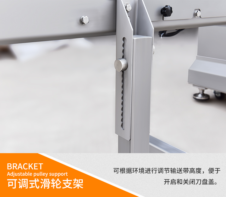 產品主要外觀有:觸摸屏、抓手、入料口、安全感應器、PVC透明安全蓋板、出料口、收料盒、擋邊板、調節移動支架、傳送輸送帶