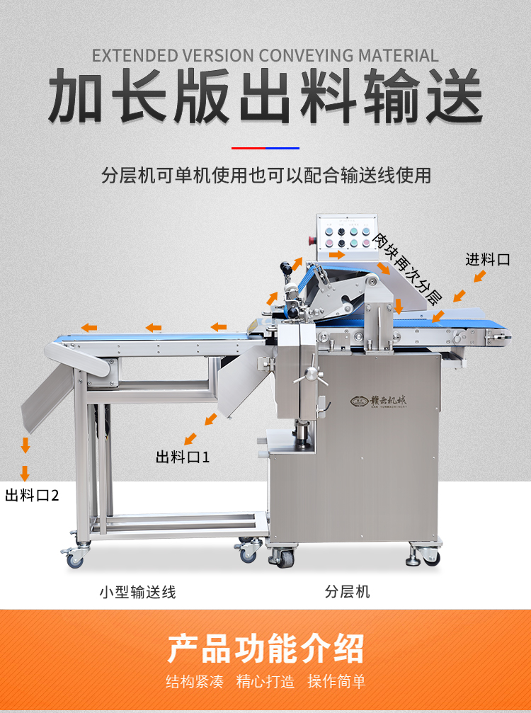贛云350鮮肉開片分層機,全自動分層機,適用于切割鮮肉、雞胸肉、里脊肉、瘦肉等肉制品加工切片的設備,切肉片機器使用不銹鋼材質,環形切刀,厚薄可調,切肉機分層機增加了小型輸送線,多功能切肉片機器適用于肉制品加工廠,中央廚房設備中。